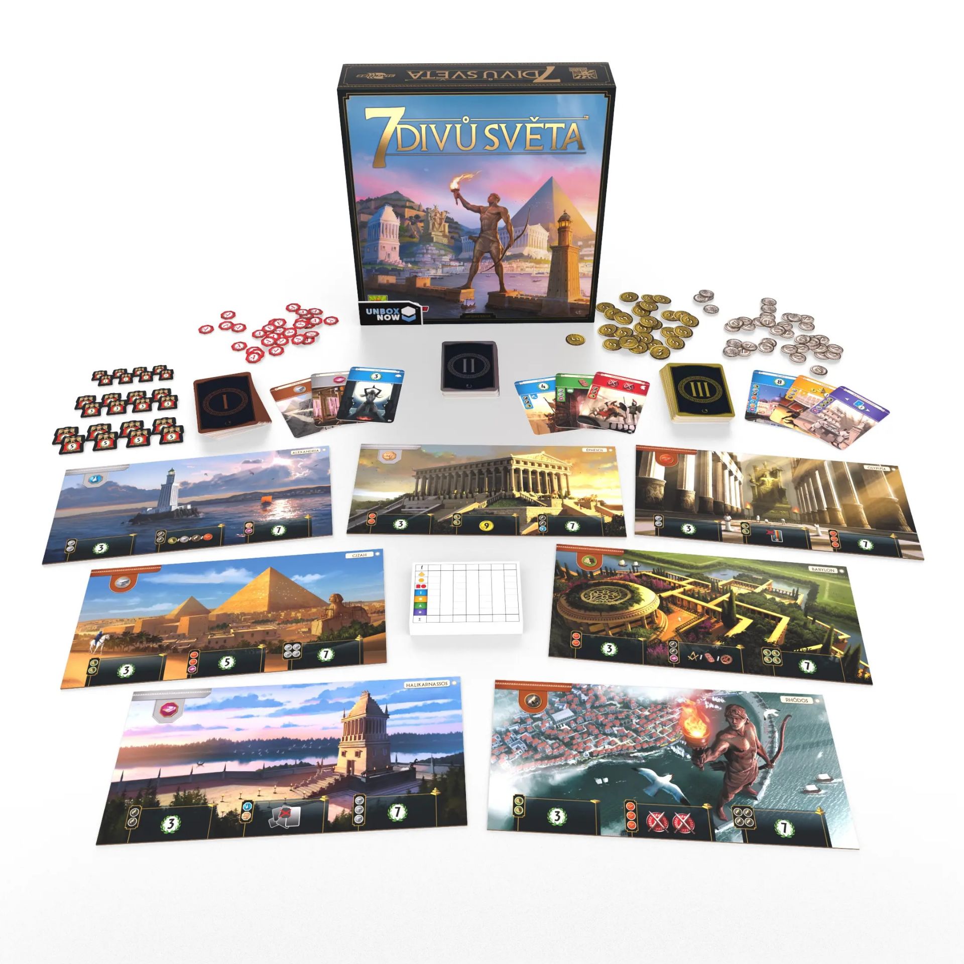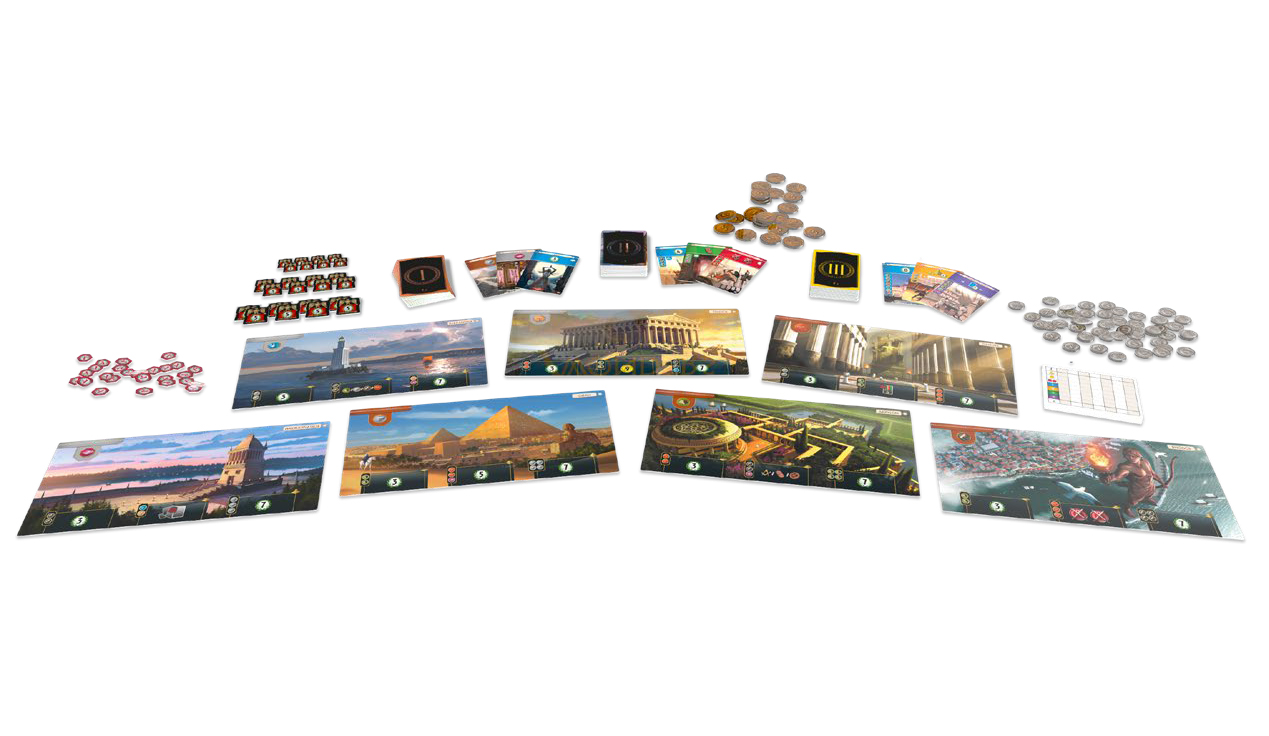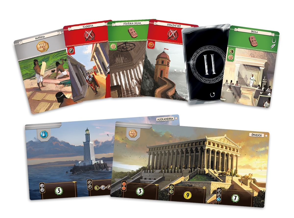 7 divů světa je v podstatě karetní vývojová hra. Některé karty mají okamžité efekty, jiné poskytují bonusy nebo vylepšení později ve hře, a další poskytují slevy na budoucí nákupy. Některé karty zvyšují vojenskou sílu pro překonání sousedů, zatímco jiné přinášejí pouze vítězné body. Každá karta je hrána okamžitě po jejím dosažení, takže víte, které karty váš soused obdrží a jak jeho volby mohou ovlivnit to, co jste dosud vybudovali. Karty se předávají vlevo-vpravo-vlevo během tří věků, takže musíte mít na paměti sousedy v obou směrech.