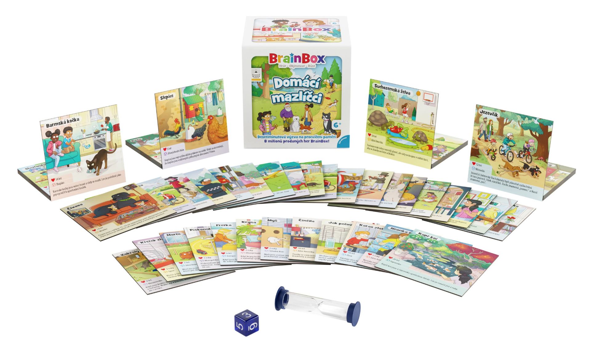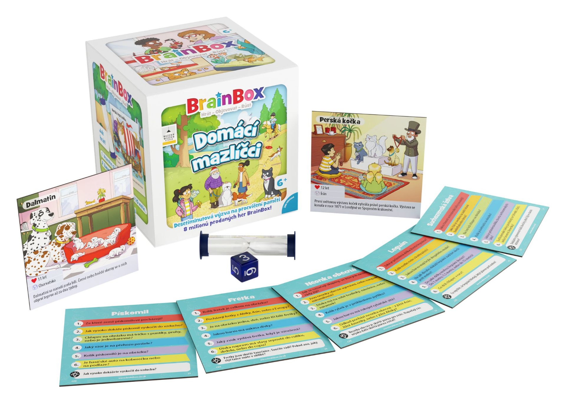 BrainBox je zábavná paměťová a postřehová hra, která prověří váš smysl pro detail a vybavování si informací. V této edici, věnované domácím mazlíčkům, se seznámíte s rozmanitými zvířaty, která obohacují naše životy, od psů a koček po přátelské plazy a hlodavce. Hra obsahuje 55 hracích karet s krásnými ručně malovanými ilustracemi, které oživují jednotlivé mazlíčky. Cílem je během 10 vteřin si zapamatovat co nejvíce informací z karty, předhodit kostku a správně odpovědět na otázku. BrainBox rozvíjí důležité kognitivní dovednosti a nabízí skvělou zábavu pro celou rodinu. Balení zahrnuje karty, pravidla, přesýpací hodiny a kostku.