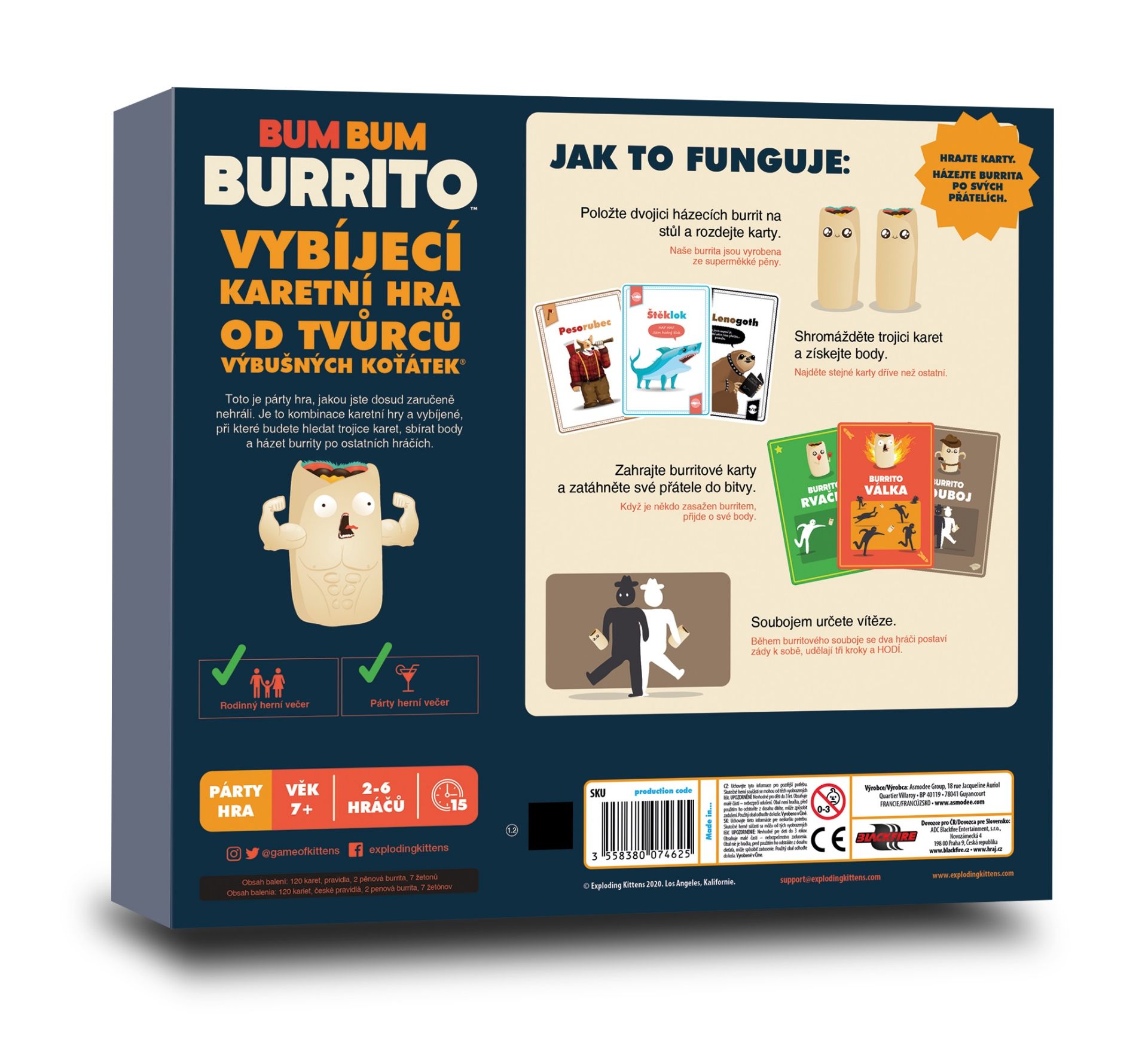 Představujeme vám úplně první karetní hru od tvůrců Výbušných koťátek a Bum Bum Burrita, která přináší šermířské souboje pomocí měkkých mečů. V této hře se hráči hádají o karty a řeší své spory údery pěnovými meči... přesně tak, jak to dělají dospělí! Jak na hru? Hra je jednoduchá! Cílem je sesbírat 3 shodné karty. Když potřebujete stejnou kartu jako jiný hráč, musíte o ni bojovat! Vezměte si určité množství karet a položte je na hromádky uprostřed stolu. Každý hráč si prohlédne karty na stole a určí, která hromádka mu pomůže dokončit jeho sadu. Jakmile se rozhodnete, kterou hromádku chcete, napočítejte do 3 a všichni současně ukažte na vybranou hromádku. Pokud jste jediní, kdo na hromádku ukázal, získáváte všechny karty na této hromádce. Pokud však na hromádku ukáže i jiný hráč, musíte se o ni utkat pomocí mečů. Pravidla pro tuto bitvu jsou popsána na hromádce karet, o kterou bojujete. Hrajte dále, dokud jeden z hráčů nezíská 3 sady stejných karet. Ten se stává vítězem hry! Tato hra je skvělá pro děti i dospělé a můžete ji hrát kdykoli během dne nebo večera. Věk a výška nehraji roli! Hlavní je, jestli máte chuť se pobavit a zasmát při „boji“ s falešnými meči. Užijte si spoustu zábavy a napětí s touto jedinečnou hrou, která přinese smích a soutěžení do vašich setkání s přáteli a rodinou!