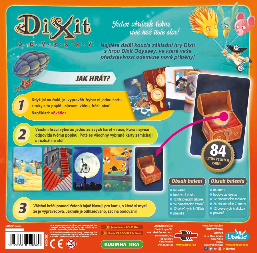 Obohaťte svou hru s rozšířením "Dixit - Origins"! Toto rozšíření přináší 84 nových a originálních obrázkových karet, které můžete kombinovat se základní hrou. Pokud jste se již dokonale seznámili s původními kartami, těchto 84 zbrusu nových ilustrací vnesou do vašeho hraní nový vítr a nabídnou hodiny nekonečné zábavy. Vydáte se na cestu své představivosti s krásně ilustrovanými kartami od Clementa Lefevreho. Hra Dixit vás vyzve, abyste se stali vypravěčem a vymýšleli jedinečné příběhy. Díky jednoduchým pravidlům si tuto zábavu mohou užít hráči napříč všemi věkovými kategoriemi, včetně dětí, které také podporuje v rozvoji fantazie. **Jak se hraje Dixit:** Každé kolo jeden hráč hraje roli vypravěče, vybere kartu a poskytne nápovědu, jakoukoliv formou – ať už slovem, větou nebo písní. Ostatní hráči si poté vybírají karty, které považují za nejlepší odpověď na tuto nápovědu. Jakmile se karty odhalí, hráči hlasují o tom, která karta patřila vypravěči. **Skórování:** Pokud nikdo nebo všichni uhodnou správnou kartu, vypravěč nezíská žádné body, ale ostatní hráči obdrží 2 body. Jinak vypravěč a správní hádači získají 3 body. Hráči získávají 1 bod za každé hlasování, které jejich karta obdrží. **Konec hry:** Hra končí, když jeden nebo více hráčů dosáhne 30 bodů. Hráč s nejvyšším počtem bodů vyhrává. Rozšíření není samostatnou hrou a vyžaduje základní hru Dixit nebo Dixit Odyssey. Můžete kombinovat karty z této edice s komponenty z hlavní hry pro ještě větší variabilitu. Připravte se na kreativní chvíle plné fantazie s "Dixit - Origins"!