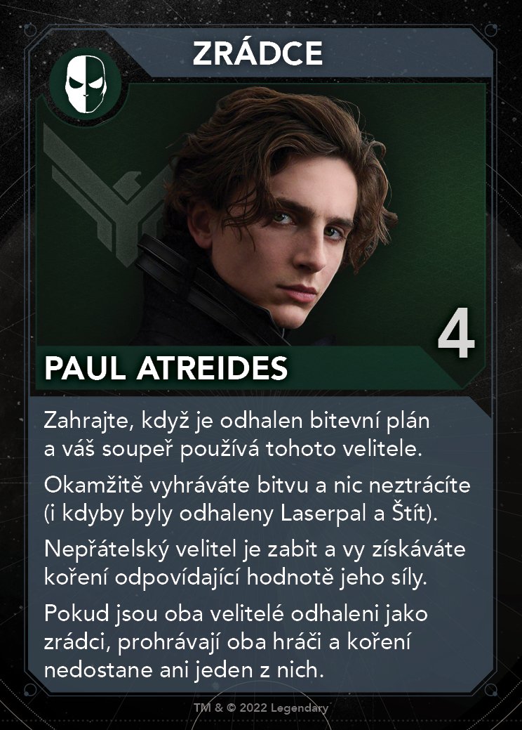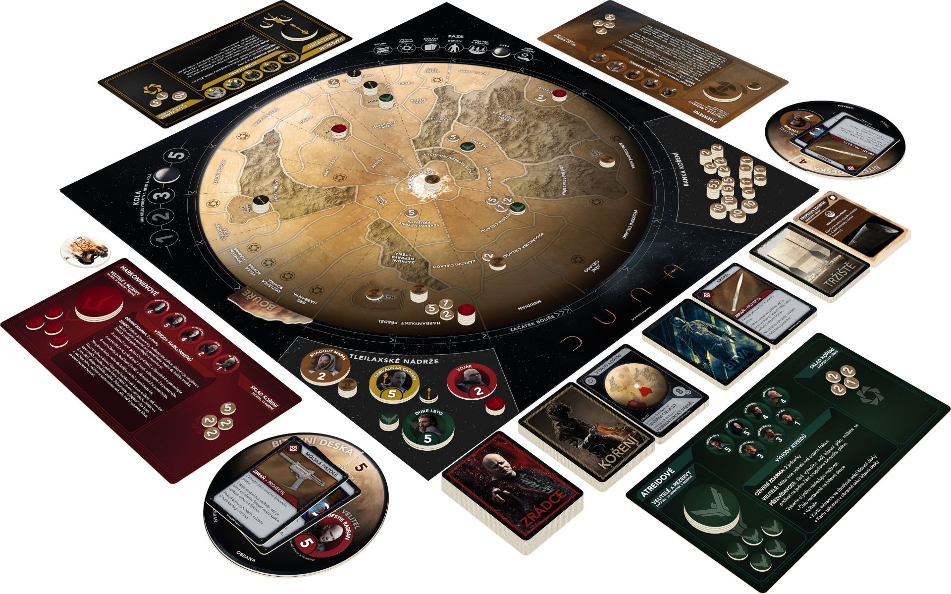 Vstupte do světa "DUNA" a staňte se součástí jednoho z nejslavnějších science fiction příběhů všech dob! Ujměte se jedné ze čtyř mocných frakcí – rodu Atreidů, rodu Harkonennů, Fremenů nebo Impéria – a bojujte o kontrolu nad nejcennějším zdrojem ve vesmíru: melanží, tajemným kořením těženým na planetě Arrakis. Přesuňte své jednotky na Dunu, těžte koření, obsazujte pouštní pevnosti a eliminujte své nepřátele. Kdo ovládne Dunu? To záleží především na vašich strategických rozhodnutích! Hra se hraje ve více fázích, kde některé fáze nemají specifické akce hráčů. Například v fázi koření se aktivuje karta **Spice Blow**, díky které se koření přidává na herní desku nebo se objeví písečný červ, který zaútočí na území s kořením. V fázi karet si každý hráč vytáhne až 4 karty boje a poté může zakoupit tržní karty. Hráči se střídají ve vykládání a pohybu svých jednotek na herní desce. Hra probíhá po dobu 3 až 5 kol. Od 3. kola může hra skončit, pokud někdo obsadí 3 pevnosti. Pokud k tomu nedojde do konce 5. kola, vítězí hráč s nejvíce kořením (každá obsazená pevnost se počítá jako 5 koření). Připravte se na strategické souboje a vzrušující zážitky v hře "DUNA"!