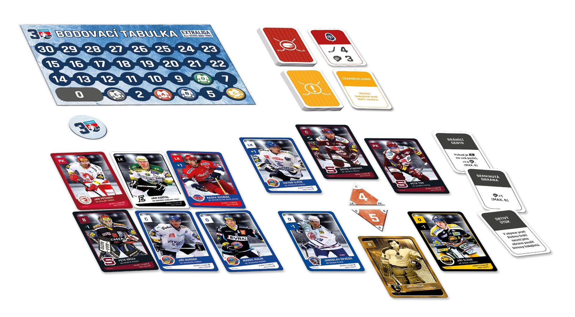 Obsah balení: 110 karet hokejistů, 17 karet soupeřů, 5 karet losu, 20 karet událostí, 18 trenérských karet, 1 žeton prvního hráče, 30 žetonů síly týmu, 5 bodovacích žetonů, 12 šestistěnných kostek, 1 bodovací tabulka, 1 pravidla hry.