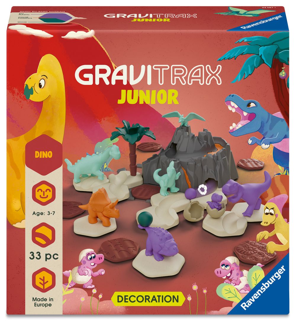 GraviTrax Junior je interaktivní systém kuličkové dráhy pro děti od 3 let. Ti nejmenší si staví své vlastní světy z kuličkových drah, které lze podle libosti zdobit a vytvářet tak jednotlivé tematické světy. Děti si tak při kreativním stavění užijí mnoho zábavy. Ve spojení se startovací sadou se děti od 3 let mohou okamžitě ponořit do světa dinosaurů. Různorodé dinosauří figurky, působivá sopka a další tematické prvky poskytují nekonečné možnosti stavění a hraní. Všechny součásti jsou vyrobeny z dřevěného bioplastu.