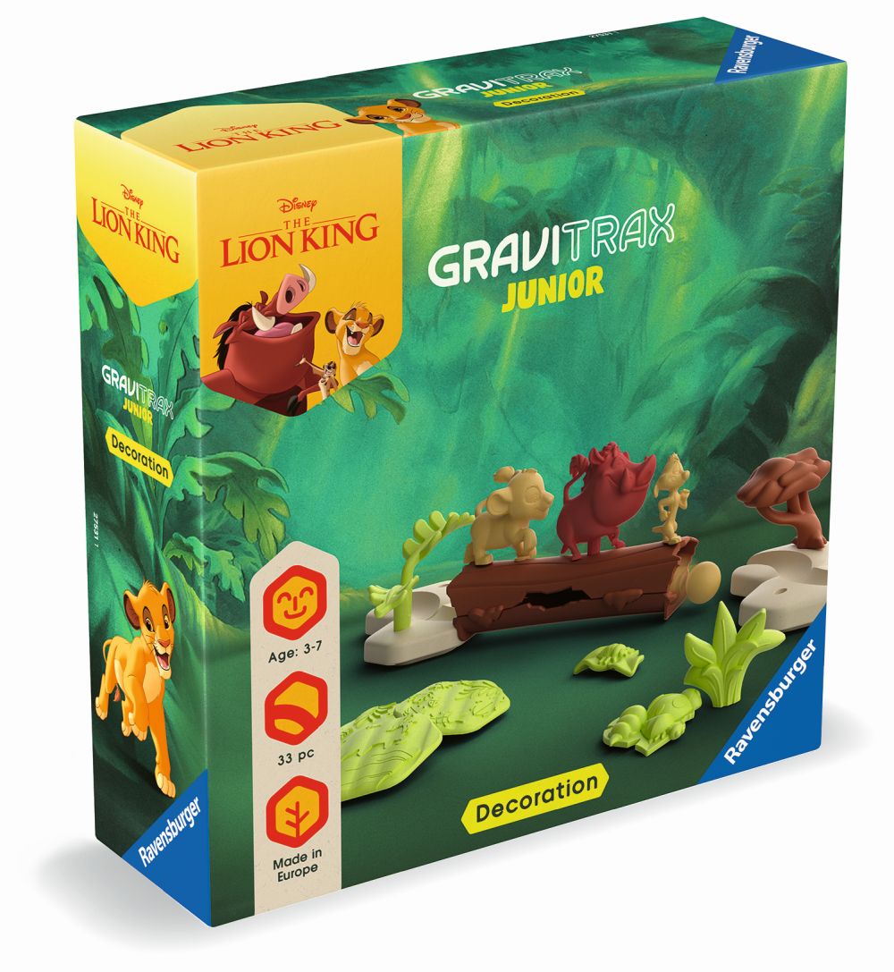 GraviTrax Junior je interaktivní systém kuličkové dráhy pro děti od 3 let. Ti nejmenší si staví své vlastní světy z kuličkových drah, které lze podle libosti zdobit a vytvářet tak jednotlivé tematické světy. Rozšíření Disney: Lví král obsahuje herní figurky Simby, Pumby, Timona a různé dekorační prvky, jako je velký kmen stromu a spoustu dalších. Děti si tak sami mohou přeměnit GraviTrax dráhu na vlastní svět Lvího krále. Hra s figurkami a stavebními komponenty a zdobení tematických světů podporuje kreativní hraní rolí, představivost a jemnou motoriku. Spojuje se zde stavění a zábava při hraní. Všechny stavební a dekorační součásti jsou vyrobeny z dřevěného bioplastu. Rozšíření obsahuje 33 stavebních a dekoračních prvků.