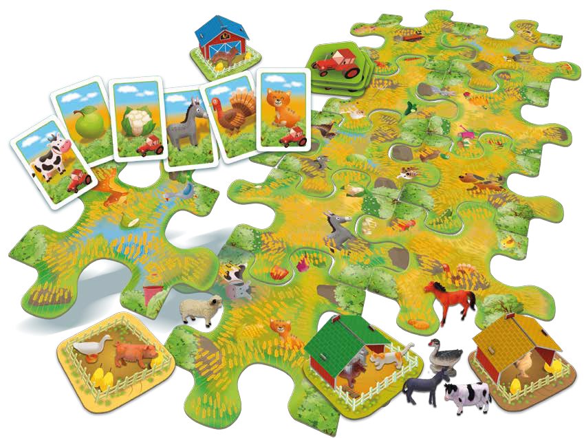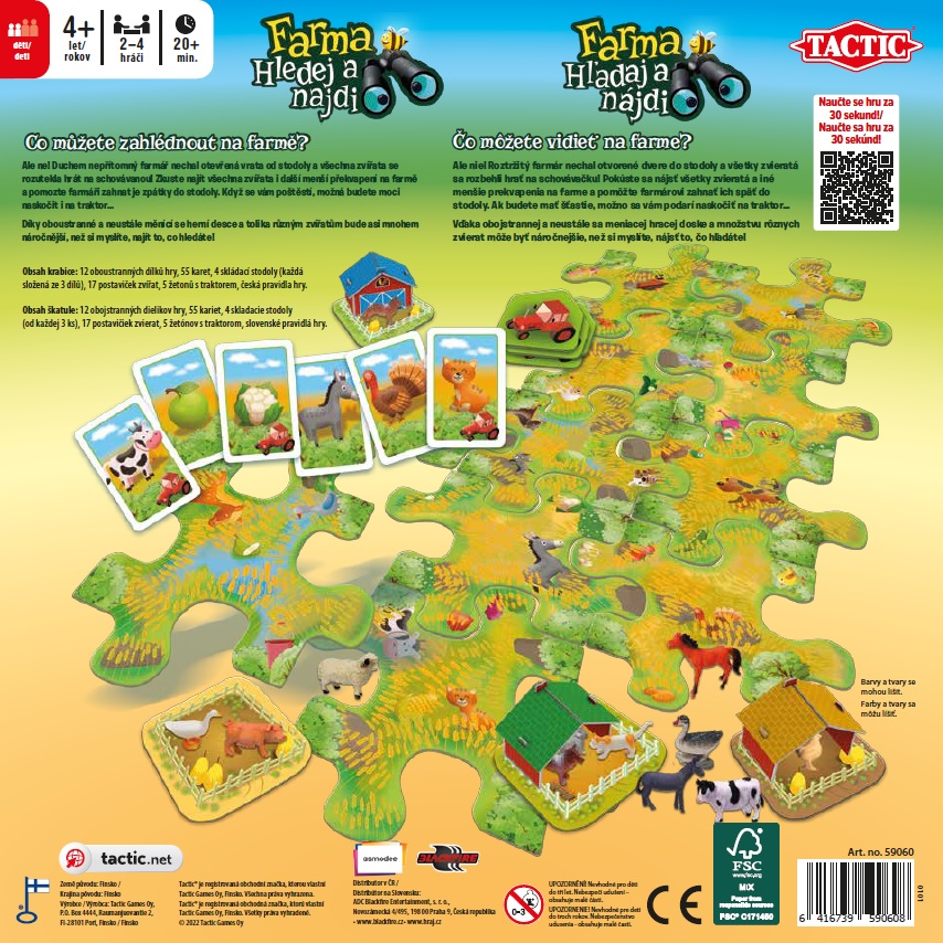 Obsah balení: 12 oboustranných dílků hry, 50 karet, 4 skládací stodoly, 17 postaviček zvířat, 5 žetonů s traktorem, 1 česká a slovenská pravidla hry.