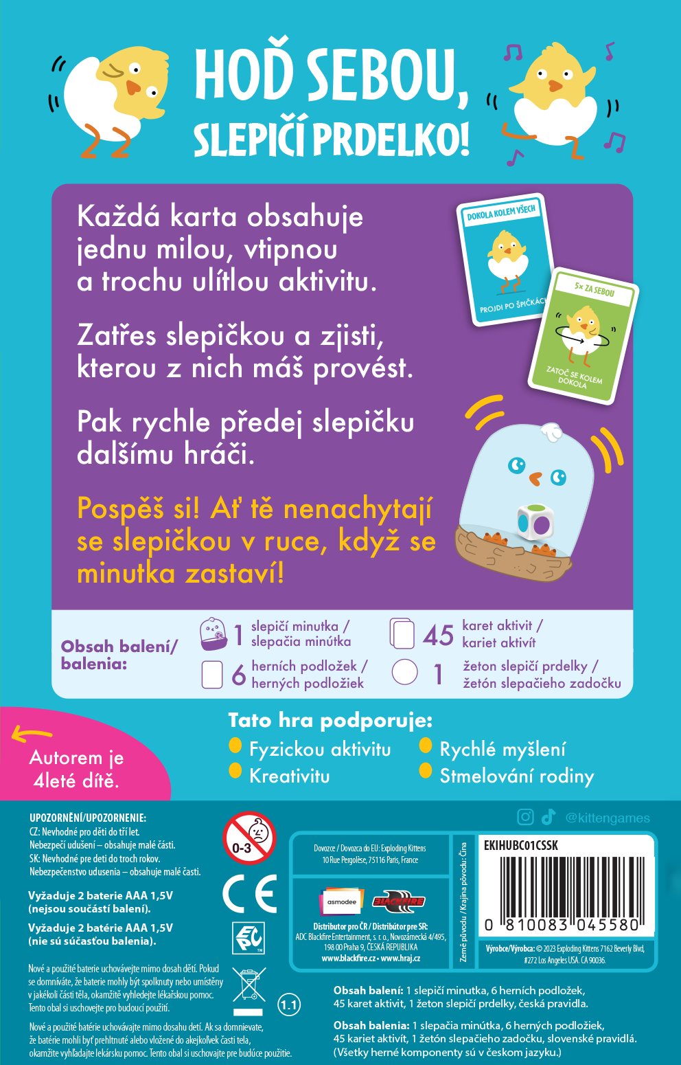 Připravte se na spoustu zábavy s hrou **Hoď sebou, slepičí prdelko** od tvůrců **Výbušných koťátek**! Tato zábavná hra je ideální pro celou rodinu, včetně těch nejmenších, a byla inspirována čtyřletou holčičkou, která spolu se svým tatínkem Elanem Leem vytvořila hru, která nese elementy zábavy a učení. **O co ve hře jde?** Každá karta obsahuje milou, vtipnou a trochu ulítlou aktivitu. Zatřeste slepičkou a zjistěte, kterou z aktivit máte provést. Jakmile úkol splníte, rychle předáte slepičku dalšímu hráči. Pospěšte si! Nechcete být chyceni se slepičkou v ruce, když se minutka zastaví! **Cílem hry** je co nejrychleji plnit bláznivé aktivity a nenechat se nachytat při držení slepičky, když se čas vyprší. Tato hra určitě nadchne jak děti, tak rodiče a podpoří fyzickou aktivitu, kreativitu, rychlé myšlení a rodinného ducha. Připravte se na nezapomenutelné chvíle plné smíchu a akce s hrou **Hoď sebou, slepičí prdelko**!