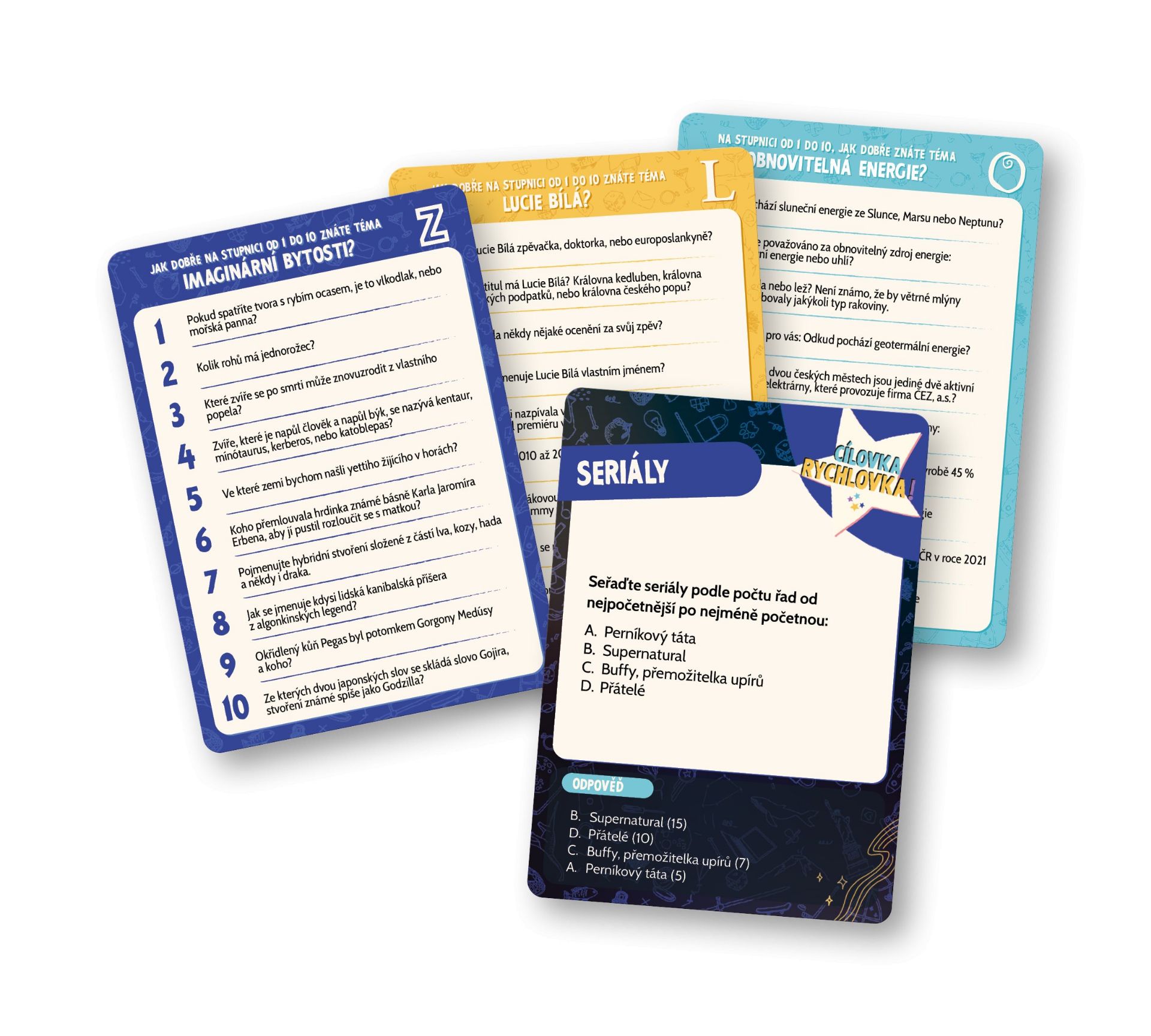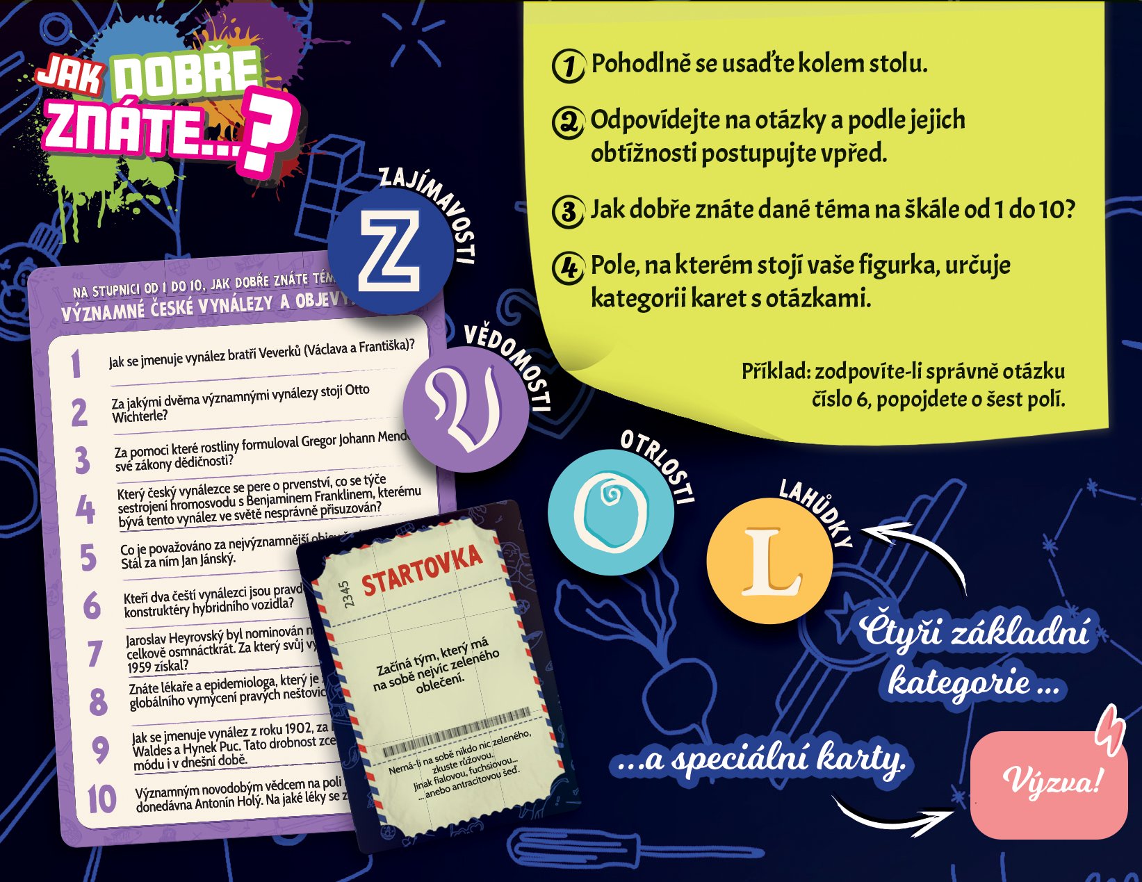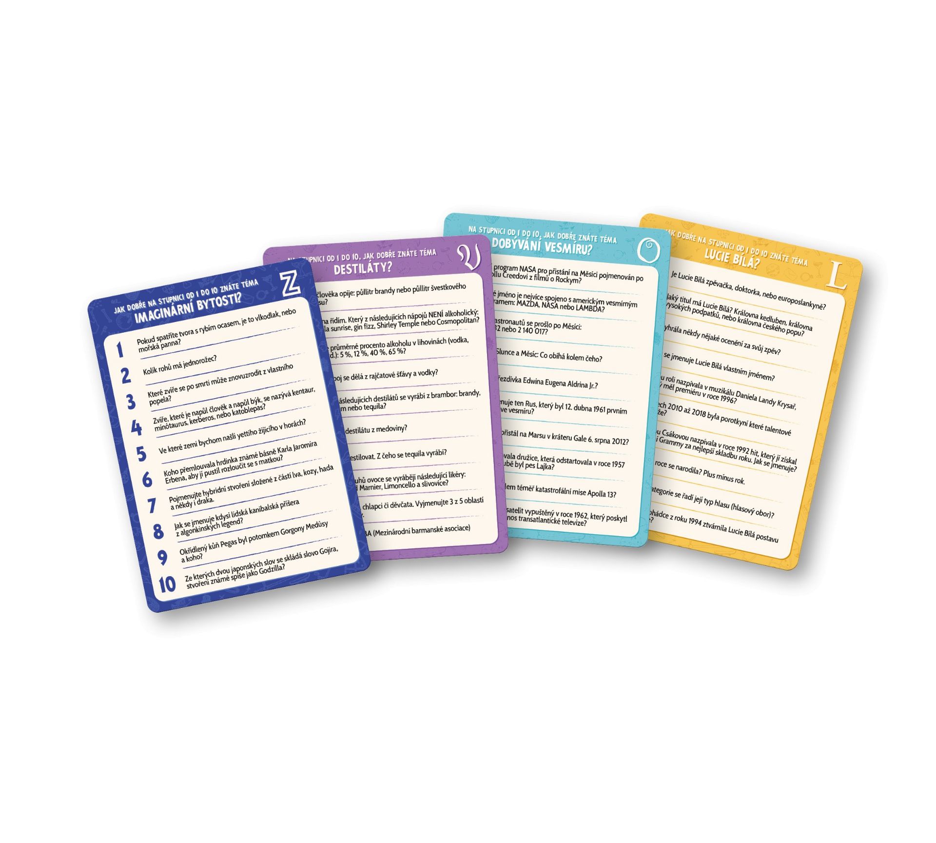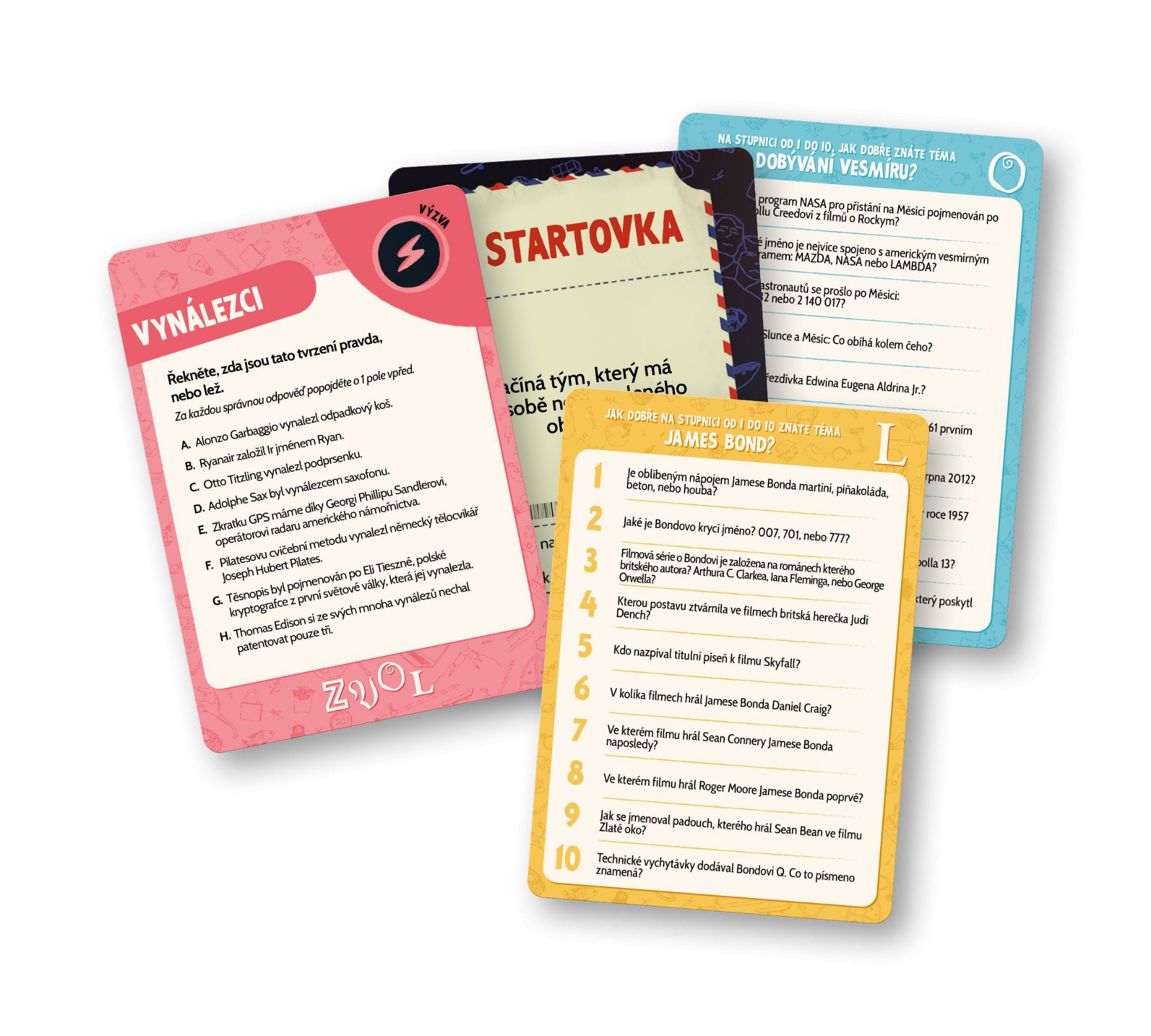 - Odpovídejte na otázky: Podle obtížnosti otázky postupujete na herním plánu vpřed. Čím vyšší hodnocení (1–10), tím těžší otázka, ale také větší odměna v podobě posunutí figurky.