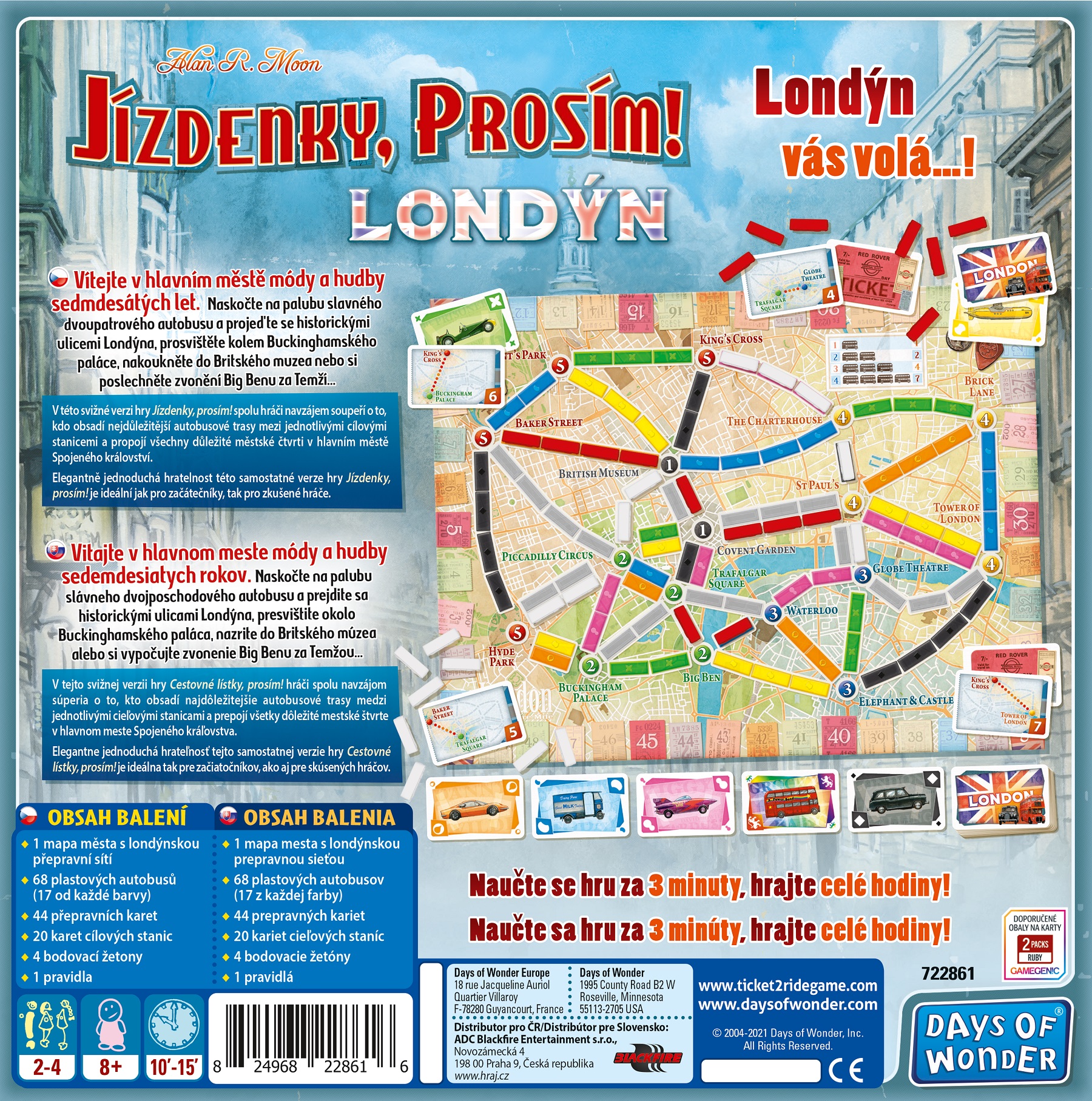 Jízdenky, prosím! - Londýn přináší oblíbenou herní mechanics ze série Jízdenky, prosím! na zmenšené mapě Londýna ze 70. let, což umožňuje hrát za maximálně 15 minut. Hráči začínají s autobusy, přepravními kartami a cílovými jízdenkami, které je spojují s různými místy v Londýně. Během tahu mohou táhnout karty, obsazovat trasy nebo si vybrat nové cílové jízdenky. Hra končí, když někdo z hráčů spotřebuje většinu svých autobusů, a poté se bodují obsazené trasy, splněné jízdenky a spojení čtvrtí. Obsah balení zahrnuje mapu s přepravní sítí, plastové autobusy, karty a bodovací žetony, což dodává této rychlé a strategické hře naprosto unikátní zážitek!