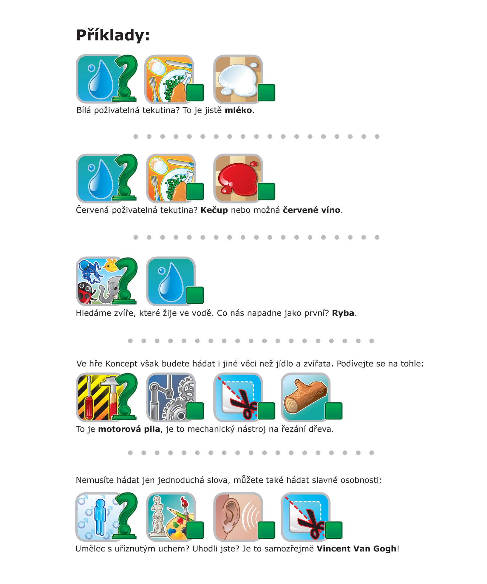 Aby dali ostatním hráčům tip na „mléko“, umístí například ikonu otazníku (která představuje hlavní koncept) na ikonu pro tekutiny, a poté umístí kostky této barvy na ikony pro „jídlo/nápoj“ a „bílou“. Pro složitější koncept, jako je „Leonardo DiCaprio“, může tým použít hlavní koncept a odpovídající kostky, aby naznačil, že hledanou frází je herec nebo režisér, a následně pomocí ikon subkonceptů a shodných kostek dále naznačit konkrétní filmy, ve kterých DiCaprio hrál, jako je například Titanic nebo Počátek.