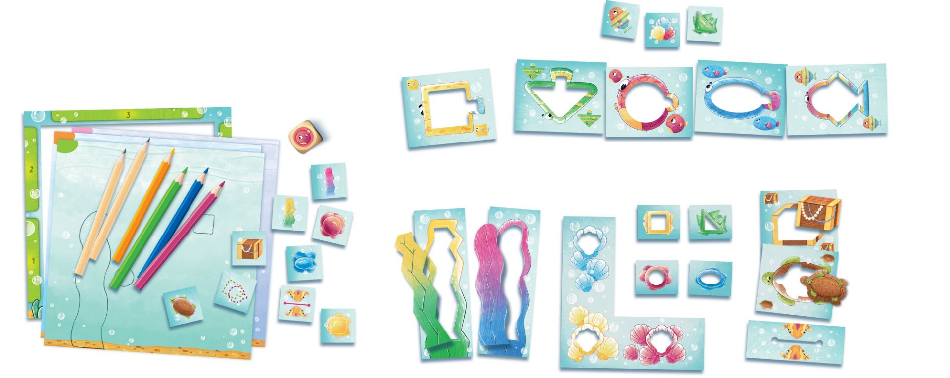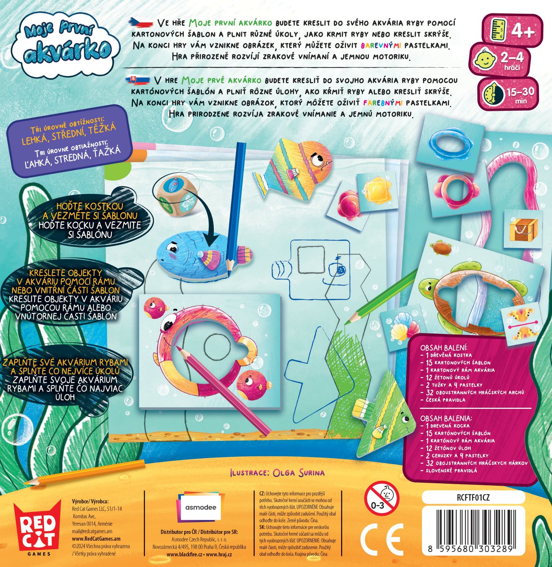 Ve hře Moje první akvárko se děti ponoří do světa akvárií, kde zaplňují své akvárium rybami pomocí kartonových šablon a plní různorodé úkoly, jako krmení ryb nebo vytváření skrýší. Hra podporuje zrakové vnímání a jemnou motoriku dětí a nabízí tři úrovně obtížnosti. Jak na to? Vyberte si obtížnost, hoďte kostkou a obkreslete šablonu, kterou označí. Po určitém počtu kol obodujte své akvárium podle splněných úkolů. Obsah balení zahrnuje dřevěnou kostku, kartonové šablony, rám akvária, žetony úkolů, tužky a pastelky, hráčské archy a pravidla v češtině a slovenštině. Hra zaručuje hodiny kreativní zábavy pro malé umělce!