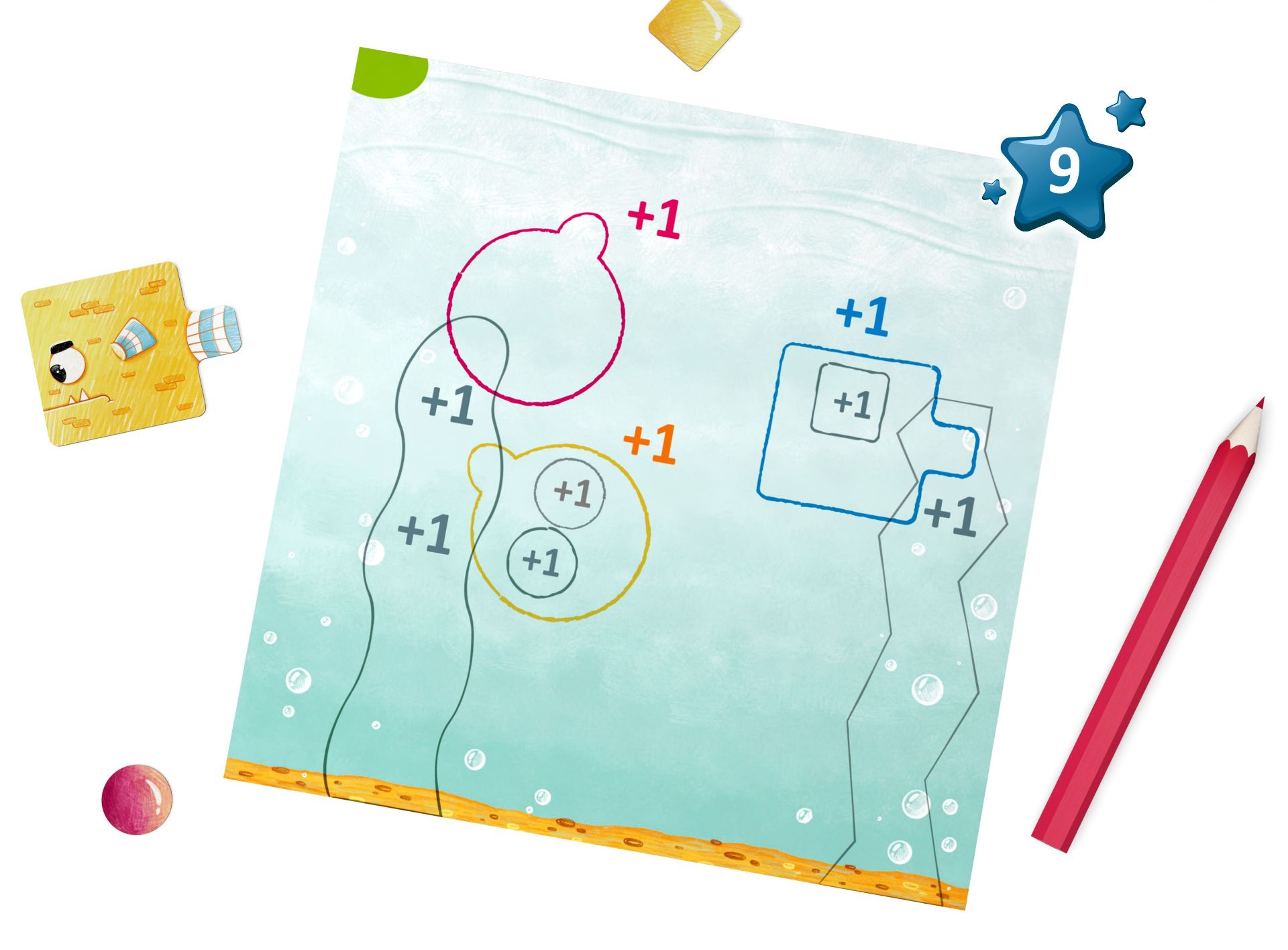 - Když jste na řadě, hoďte kostkou, která určí šablonu, kterou budete muset obkreslit do svého akvária.