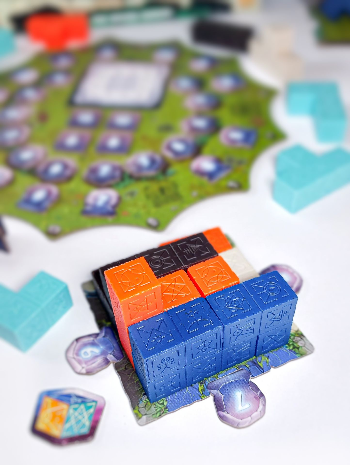 Pro nastavení hry si náhodně vyberte kartu struktury a umístěte ji na hlavní herní plán spolu s odpovídajícími žetony struktury, žetony úrovně a žetony proroctví na základě počtu hráčů. Umístěte krystalový ukazatel vedle hlavního plánu, poté vytáhněte dvanáct náhodných polyomino kostiček z krabice a rozložte je do kruhu kolem herního plánu. Polyomino kostičky jsou k dispozici v pěti barvách a všechny 1x1 bloky v těchto barvách jsou uloženy na straně.