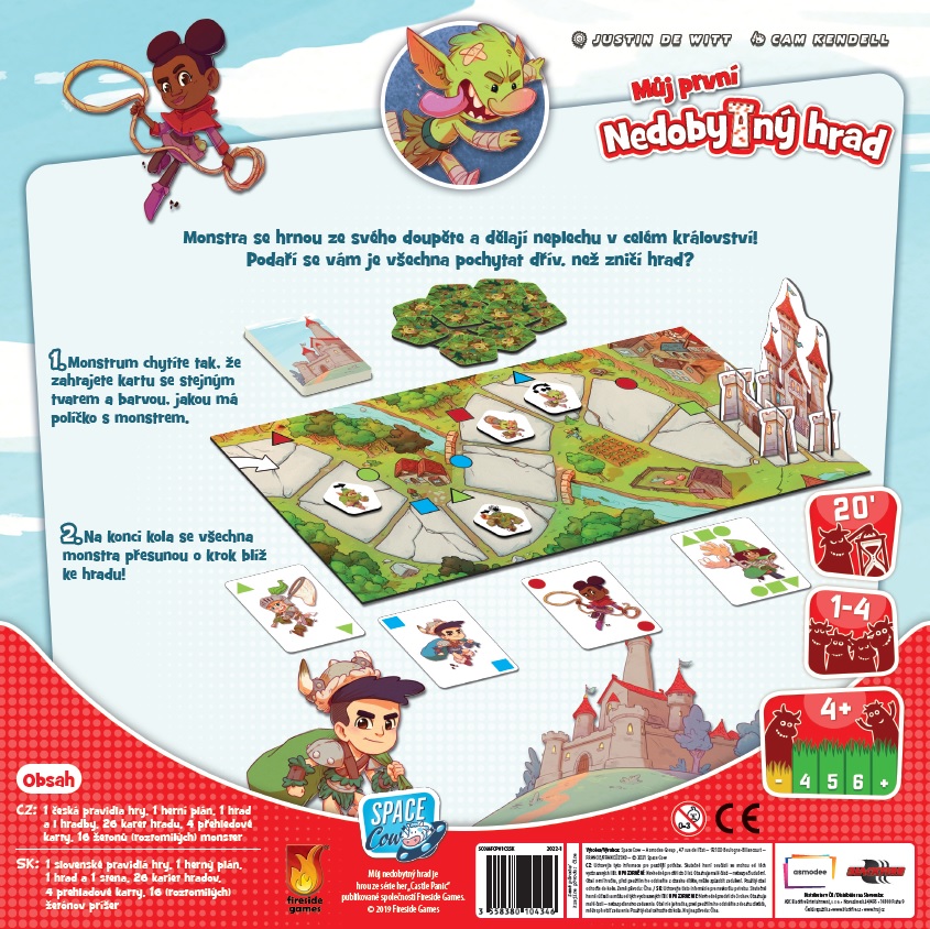 Můj první Nedobytný hrad je kooperativní hra, ve které se hráči musí spojit, aby zastavili hrnoucí se monstra mířící k hradu. Společně plánují strategii a ukazují si karty, aby chytli monstra dříve, než zničí hrad. Monstrum chytíte zahráním karty se stejným tvarem a barvou, jakou má políčko s monstrem. Na konci kola se všechna monstra posunou o krok blíž k hradu, takže hráči musí jednat rychle! Obsah balení zahrnuje herní plán, hrad a hradby, karty hradu, přehledové karty, žetony monster a pravidla v češtině a slovenštině. Hra nabízí zábavnou a vzrušující výzvu pro celou rodinu!