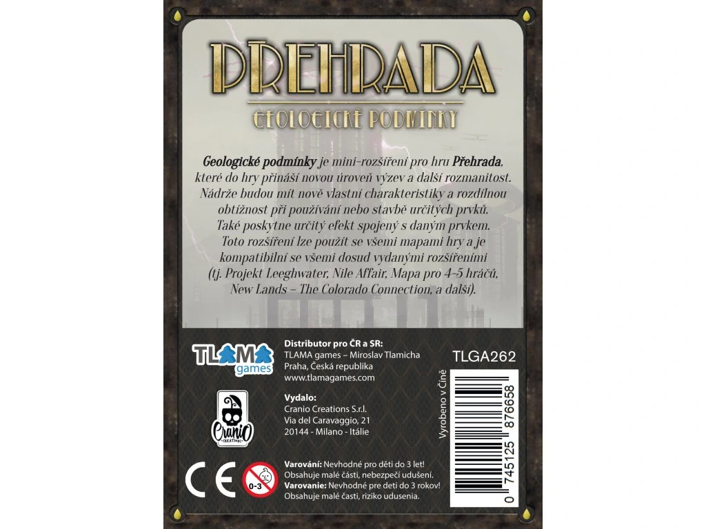 Vítejte na počátku vodní revoluce v hře **Přehrada**! Píše se rok 1922, kdy svět obnovuje svou sílu po Velké válce díky novým hydroelektrickým technologiím podle návrhů legendárního Nikoly Tesly. V Alpách se však situace vyostřuje a vy se ujmete role vedoucího mezinárodní společnosti, která usiluje o vybudování hydroelektrického impéria. Hra je určena pro 1-4 hráče od 14 let a během pěti kol budete plánovat stavby a akce související s hydroelektrickou infrastrukturou. Klíčem k úspěchu je strategické umístění vašich staveb a efektivní využití vody jako nejcennějšího zdroje. Ovládněte vodu, vyprodukujte energii a splňte smlouvy! **Herní mechaniky zahrnují:** - Řízení zdrojů a strategické umisťování - Budování a vylepšování přehrad - Využívání tlakových tunelů napojených na turbíny Hra obsahuje širokou škálu komponentů, včetně herního plánu, desek managementu, stupnice energie a desek patentového úřadu. Obsahuje také množství žetonů, karet a technologií, což přispívá k hlubokému hernímu zážitku.