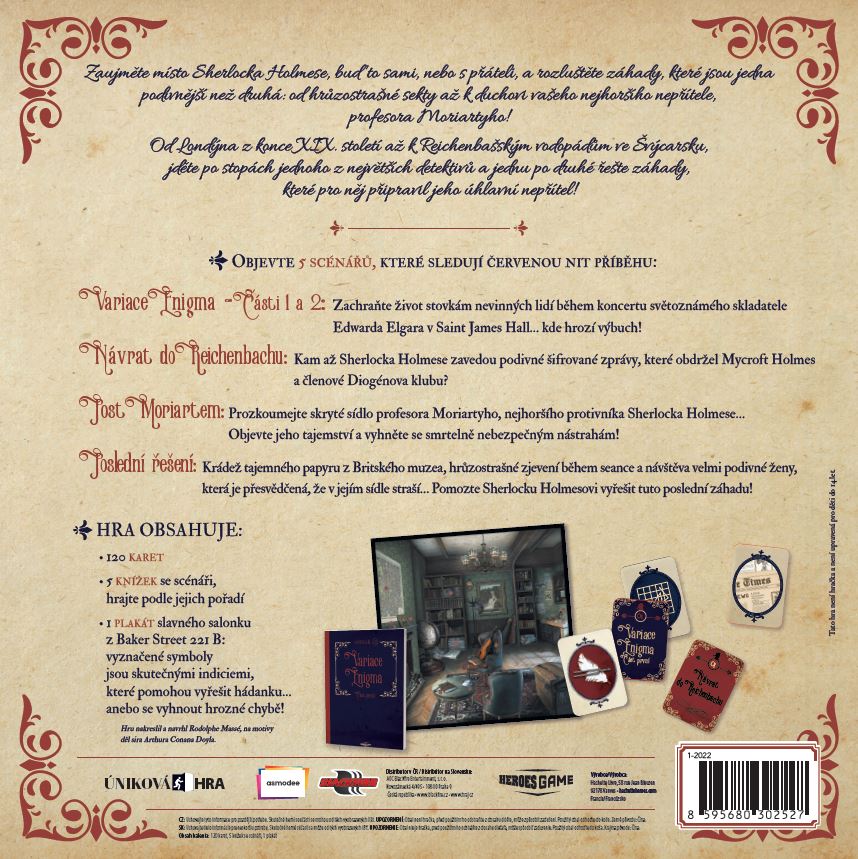 Vstupte do role slavného detektiva Sherlocka Holmese a ponořte se do světa intrik, tajemství a nebezpečí. Tato hra nabízí jedinečný zážitek pro jednoho až více hráčů, kteří se pokusí rozluštit záhady připravené úhlavním nepřítelem Sherlocka Holmese – profesorem Moriartym. Prožijte dobrodružství, které vás zavede do Londýna 19. století i k Reichenbašským vodopádům ve Švýcarsku!