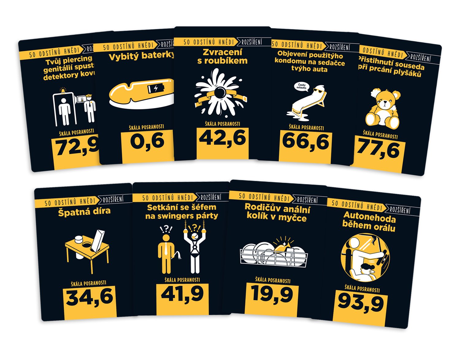 Posrat se to může komukoli a naprosto kdekoli. I v ložnici. Tato krabička obsahuje opravdu peprné situace, které budete hodnotit podle toho, jak moc jsou na hovno. Jsou příliš těsné spodky LEPŠÍ nebo HORŠÍ než sledování 4hodinového školení o sexuálním harasení? A co obří cucflek na krku? Ohodnoťte situaci, a pokud se trefíte na správné místo na naší škále posranosti, kartu si můžete nechat. Když správně ohodnotíte 10 karet, vyhráváte! Připravte se na spoustu smíchu a zábavy!