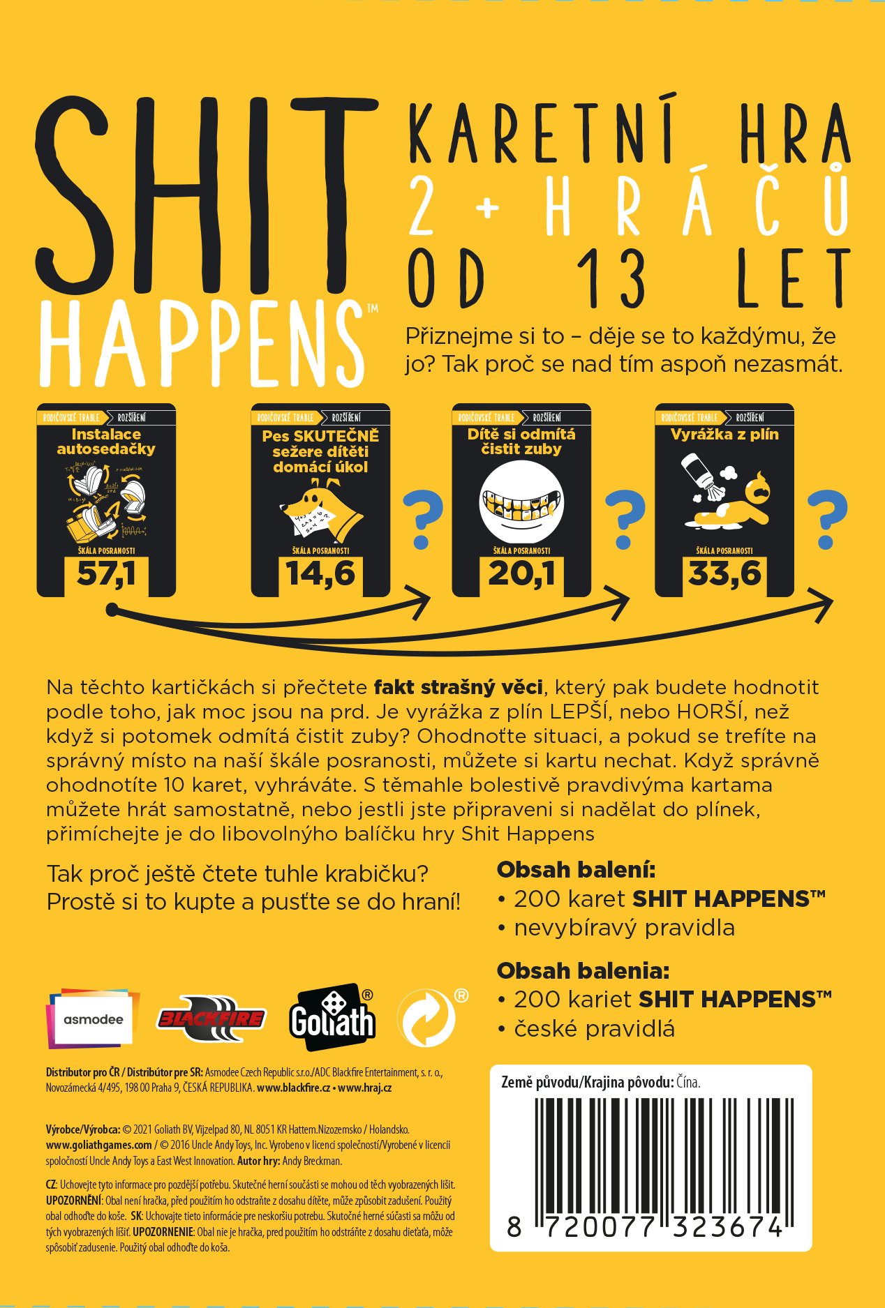Shit Happens je karetní hra, která se zaměřuje na nekorektní humor a nabízí zábavný pohled na to, co všechno se v životě může pokazit. Přiznejme si to – občas se to sere každému, takže proč se nad tím aspoň nezasmát? Na kartách najdete opravdu nepříjemné situace, které budete hodnotit podle toho, jak moc jsou „na hovno“. Například: Co je horší, popáleniny 3. stupně nebo vidět svého tátu na Adama? A co upadnutí telefonu do záchodu? Ohodnoťte situaci, a pokud se trefíte na správné místo na škále posranosti, kartu si můžete nechat. Hráč, který správně ohodnotí 10 karet, vyhrává. Připravte se na smích a nečekané situace při této výjimečné hře, která je ideální pro večery s přáteli!