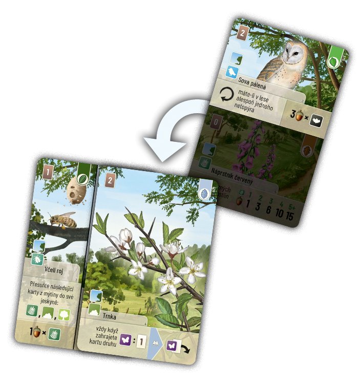 V našem lese se to hemží životem, zvířata se prohánějí po mýtinách a hledají potravu. Některá si užívají husté vrcholky stromů, zatímco jiná dávají přednost bohatému lesnímu podrostu, který jim poskytuje bezpečný úkryt. Ve hře Smíšený les budete vytvářet ekologicky vyvážené prostředí pro flóru i faunu. Vysázením stromů vybudujete vzkvétající domov pro různé druhy živočichů, rostlin a hub. Abyste získali co nejvíce bodů, musíte splnit specifické požadavky zvířat, která vyžadují přítomnost jiných druhů, konkrétní prostředí nebo potravu. Hráč s nejvyšším počtem bodů na konci hry se stává vítězem. Jak hrát? Ve svém tahu si můžete vybrat jednu z dvou akcí: A) Doberte si dvě karty. B) Zaplaťte cenu za kartu, vyložte ji do svého lesa a aktivujte její efekty a případné bonusy. Typy karet: - Stromy: Poskytují místa pro přiřazení dělených karet na všech čtyřech stranách (nahoře, dole, vlevo a vpravo). Pokud není žádná karta přiřazena, místo se považuje za prázdné. Strom je považován za plně obsazený, pokud má všechny čtyři strany obsazené alespoň jednou kartou. - Sazenice stromů: Místo zahraní karty stromu můžete zahrát libovolnou kartu z ruky lícem dolů jako univerzální sazenici stromu. Ta poskytuje místa pro přiřazení karet, ale nepovažuje se za samostatný druh. - Zvířata, rostliny a houby: Dělené karty obsahují různé lesní organismy. Při hraní dělené karty ji musíte přiřadit k prázdnému místu na odpovídající straně stromu. OBSAH BALENÍ: - 180 karet - Bodovací bloček - Herní deska - Česká pravidla In Forest Shuffle, players compete to gather the most valuable trees, then attract species to these trees, thus creating an ecologically balanced habitat for flora and fauna. Na začátku má každý hráč v ruce šest karet, z nichž některé představují určité typy stromů a jiné dva lesní obyvatele (zvířata, rostliny, houby atd.). Během tahu můžete buď dobírat karty, nebo hrát kartu z ruky. Hra skončí, když je vytažena třetí zimní karta. Hráči pak sečtou své body na základě stromů a obyvatel ve svém lese. Hráč s nejvyšším skóre vyhrává. Smíšený les je první hrou v řadě her od Lookout, která využívá šetrné ekologické materiály, vyrobené na papíře certifikovaném FSC a bez plastu!