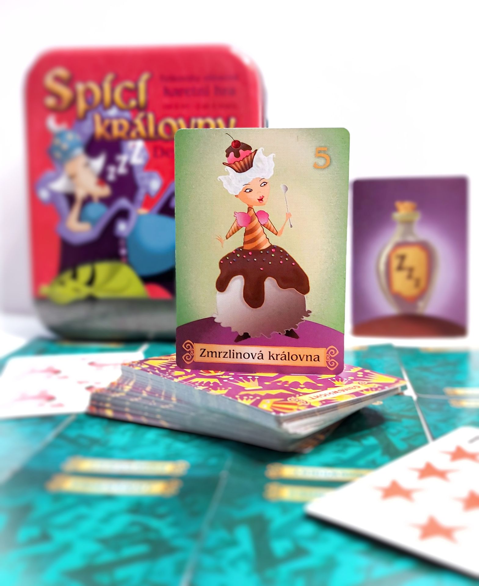 Vzhůru za velkým dobrodružstvím! Palačinková královna, Berušková královna a jejich nejbližší přátelé byli prokleti spícím kouzlem a vaším úkolem je je probudit. Použijte strategii, rychlé myšlení a trochu štěstí, abyste tyto podřimující šlechtice vynesli z jejich královského spánku. Zahrajte si na rytíře a ukradněte královnu nebo zariskujte s žonglujícím šaškem. Ale pozor na zlé lektvary a podlé draky! Tato deluxe edice obsahuje nové královny a krále a také super pohádkové samolepky s motivy Spících královen. Každá královna má na sobě určitou bodovou hodnotu, a jakmile jsou všechny požadované královny probuzené nebo jeden hráč dosáhne bodového prahu, hra končí. Hráč s nejvyšším počtem bodů vyhrává. Užijte si hodiny zábavy a napětí při probouzení královen a strategickém hraní s přáteli a rodinou!