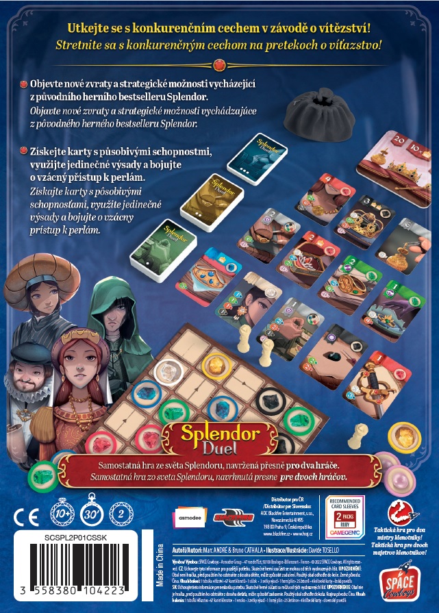 Utkejte se s konkurenčním cechem v závodě o vítězství ve hře Splendor Duel! Objevte nové zvraty a strategické možnosti vycházející z původního herního bestselleru Splendor. Získejte karty s působivými schopnostmi, využijte jedinečné výsady a bojujte o vzácný přístup k perlám. Jako mistr klenotnického cechu vytváříte majestátní ozdoby nejvyšší kvality pro panovníky a mocné představitele renesance, abyste zvýšili svou prestiž a majetek. Nicméně, pozor na ambiciózního soupeře! Připravte se na strategické souboje a zábavu, která vás vtáhne do fascinujícího světa klenotnického umění!