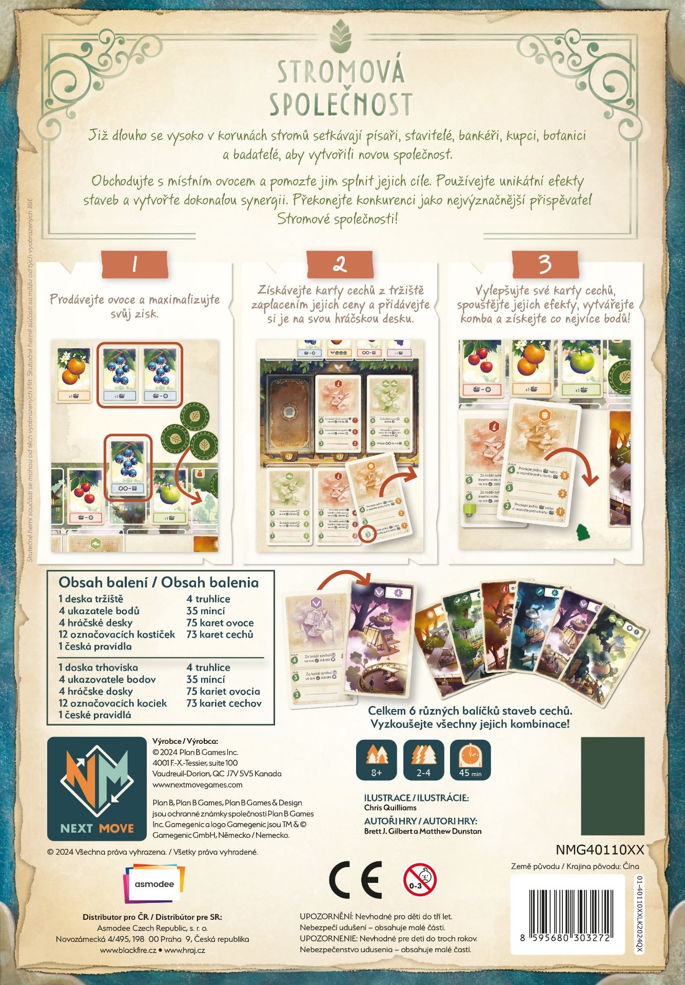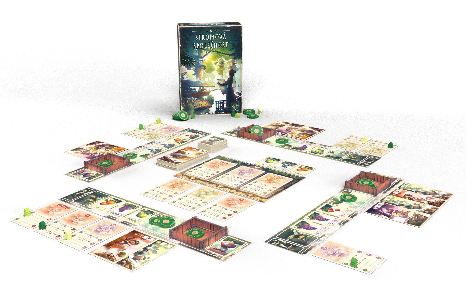 Stromová společnost je strategická hra, ve které se na vysokých korunách stromů setkávají různé profese – písaři, stavitelé, bankéři, kupci, botanici a badatelé – s cílem vytvořit novou společnost. Hráči obchodují s místním ovocem, plní cíle a vytvářejí dokonalou synergii s unikátními efekty staveb. Cílem je překonat konkurenci a stát se nejvýznačnějším přispěvatelem Stromové společnosti! Hráči prodávají ovoce, maximalizují zisky, získávají karty cechů z tržiště a vylepšují je, aby spouštěli efekty, vytvářeli komba a získávali body. Hra probíhá ve třech fázích, kde hráči ve svých tazích postupně prodávají ovoce, staví karty cechů a udržují herní stav. Připravte se na strategické obchodování a budování vaší stromové říše!
