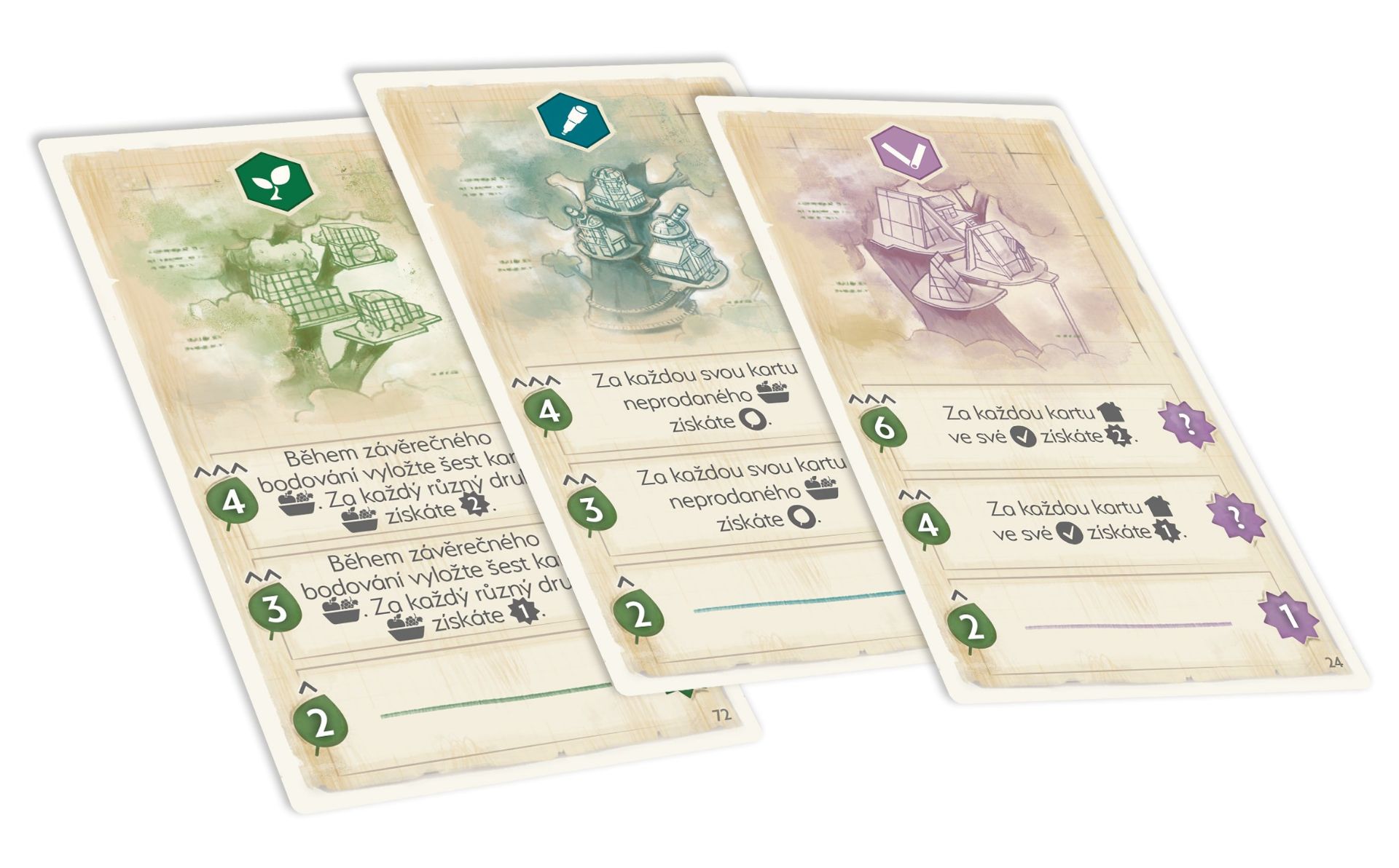 - Získávejte karty cechů z tržiště zaplacením jejich ceny a přidávejte si je na svou hráčskou desku.
