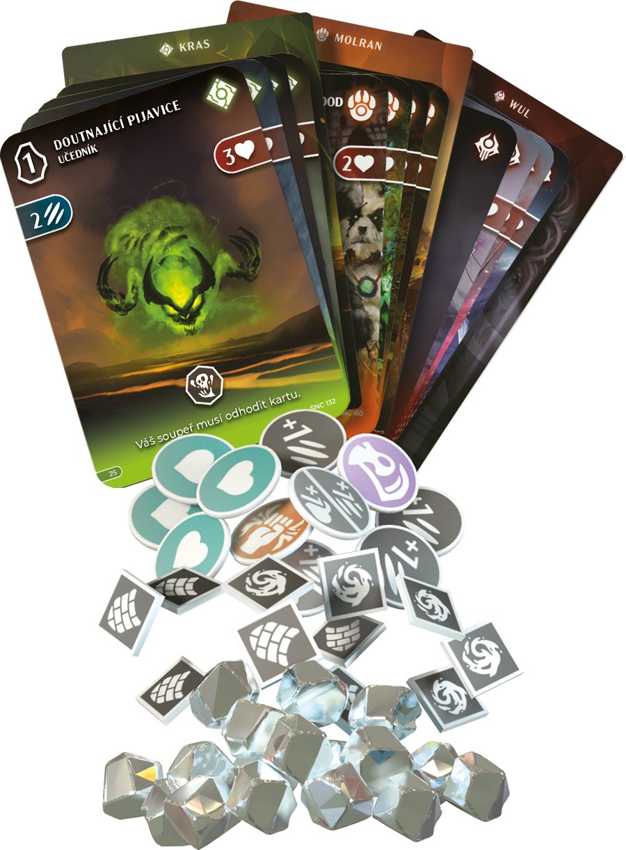 Obsah balení: 101 karet, 15 krystalů esence, 38 žetonů, pravidla.