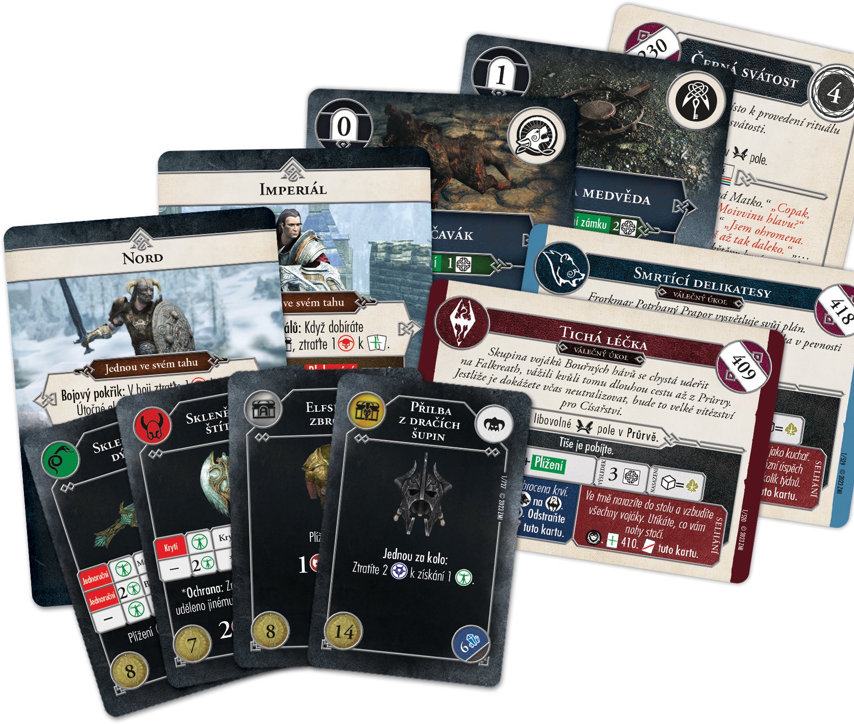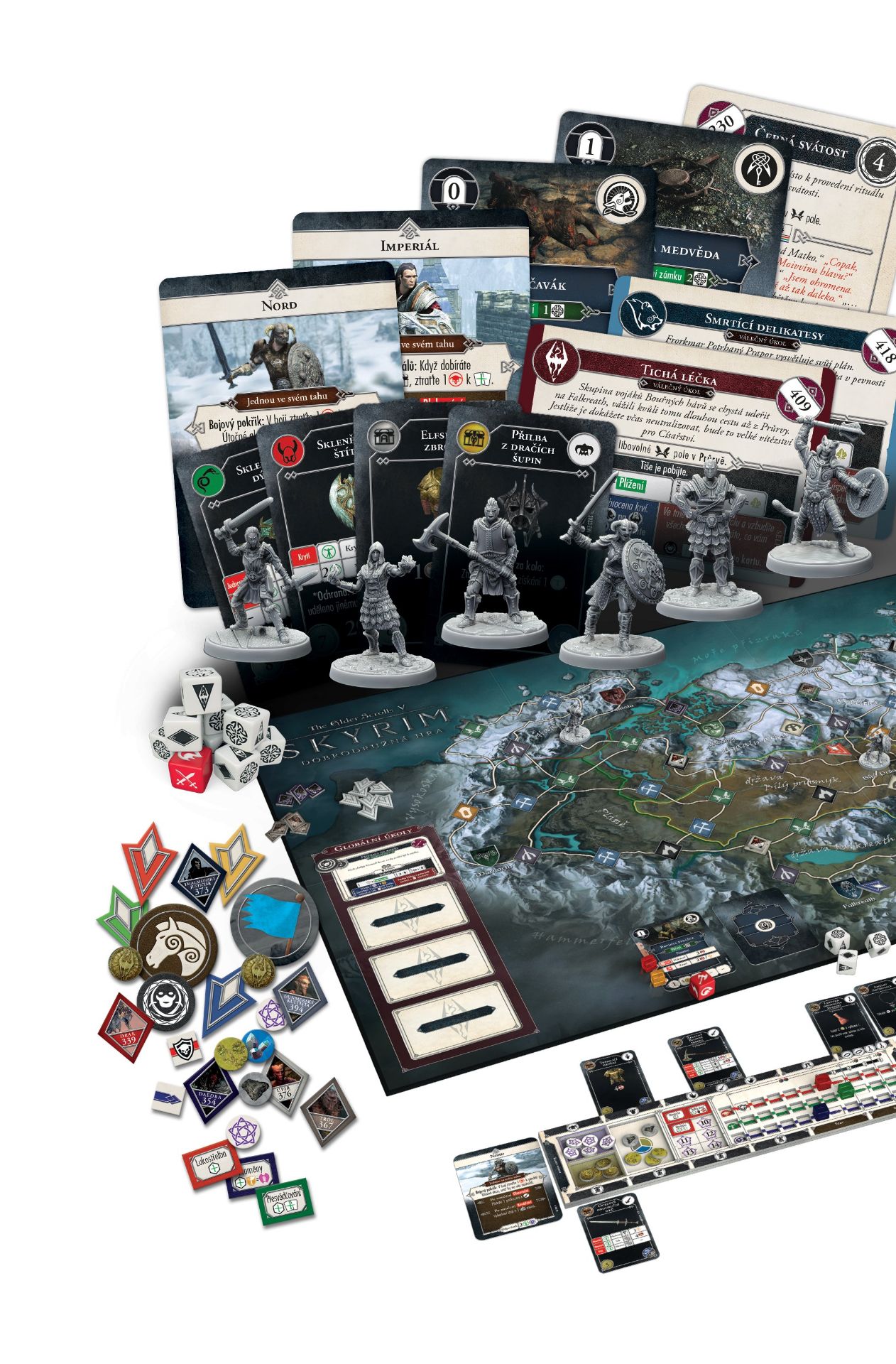 - Dynamický svět: Herní deska představuje celý Skyrim. Cestujte, prozkoumávejte dungeony a mějte se na pozoru před toulavými monstry, která blokují cesty a ohrožují pevnosti.