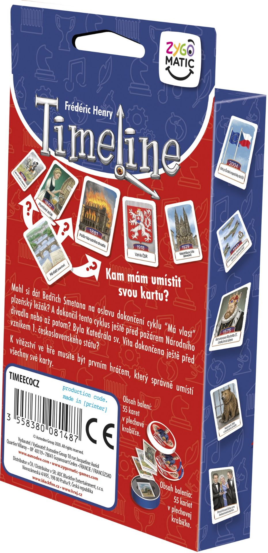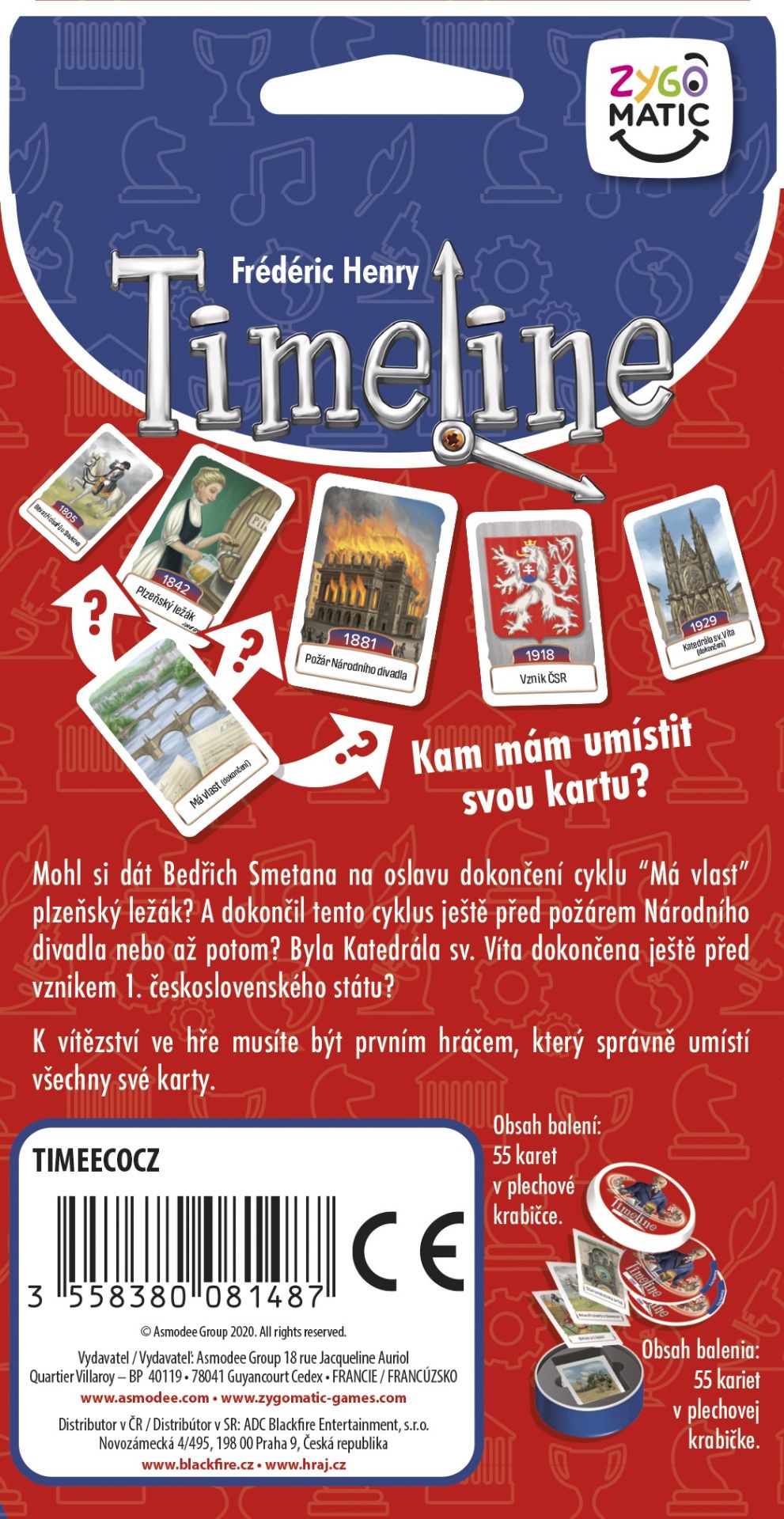 Karetní hraTimeline-Slovensko vám přináší zábavný a vzdělávací zážitek, který se zakládá na 110 kartách s významnými událostmi ze slovenské historie. Každá karta zobrazuje událost na jedné straně a rok, ve kterém k ní došlo, na druhé straně. Hráči se střídají v umisťování karet do chronologické řady na stole. Po umístění karty odhalí hráč datum a zjistí, zda byla karta správně zařazena. Pokud ano, zůstává na místě; pokud ne, karta je vyřazena a hráč si musí vytáhnout novou z balíčku. Cílem hry je jako první zbavit se všech svých karet správným umístěním. V případě, že více hráčů vyhraje v jednom kole, ostatní hráči jsou vyřazeni a vítězové obdrží karty navíc pro další kolo. Hra pokračuje, dokud nezůstane pouze jeden hráč bez karet. "Timeline: Slovensko" se skvěle doplňuje s ostatními tituly v sérii Timeline, což nabízí možnost prohloubit si znalosti o slovenské historii a bavit se zároveň!