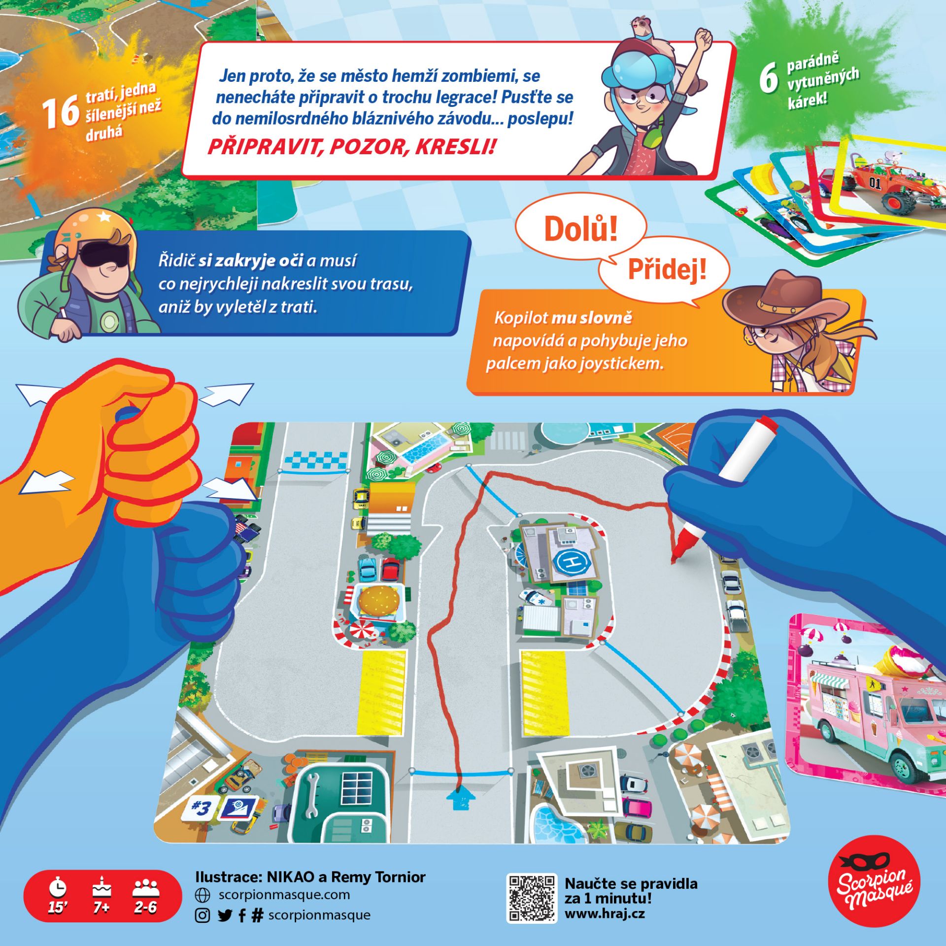 Jen proto, že se město hemží zombiemi, se nenecháte připravit o trochu legrace! Vstupte do nemilosrdného bláznivého závodu... poslepu! PŘIPRAVIT, POZOR, KRESLI! Řidič si zakryje oči a musí co nejrychleji nakreslit svou trasu, aniž by vyletěl z trati. Jeho kopilot mu slovně napovídá a pohybuje jeho palcem jako joystickem. Ve hře zvítězí tým, který jako první tři závody vyhraje! - Vytvořte 2 týmy po 2 až 3 hráčích. Týmy mohou být různě početné. - V každém týmu zvolte prvního řidiče a dejte mu fix a masku. Ostatní hráči představují kopiloty (role se budou v průběhu hry střídat). - Tým s nejmladším hráčem vybere první trať závodu. Oba týmy si vezmou kopii příslušné tratě (od každé tratě jsou k dispozici 2 kopie). - Každý řidič umístí svůj fix na startovní šipku na své desce tratě a zakryje si oči maskou. Neměl by nic vidět. Nepodvádějte! - Jeden z kopilotů se chopí palce řidiče a pohybuje jím jako "joystickem". - Oba řidiči současně začnou na základě pokynů od svých kopilotů kreslit trasu na svou desku tratě. Vaším cílem je dostat se na druhý konec tratě a nevypadnout při tom ze silnice, která je vymezena bílými liniemi. - Můžete dávat jakékoli slovní pokyny, které vám připadají užitečné, abyste se do cíle dostali co nejrychleji. - Pohybujte řidičovým palcem jako při ovládání videohry „joystickem“. Domluvte si signály – například lehký tlak pro pomalý pohyb, větší tlak pro rychlejší jízdu! - Tým, který jako první protne cílovou pásku, se stává vítězem dané tratě. Pokud vyhrajete první trať, zahrajte si další. Poražený tým má právo výběru další tratě. Pokud se jedná o druhou trať, kterou váš tým vyhrál, vyhráváte celou hru! V Turbo Kidz budete soupeřit, abyste jako první překročili cílovou čáru v sérii vtipných závodů... poslepu! Každý závod začíná, když si řidič zakryje oči a musí co nejrychleji kreslit svoji trasu, zatímco je navigován hlasovými pokyny svého kopilota, který hýbe řidičovým palcem jako joystickem, aby se vyhnul vyjetí z trati. Užijte si vzrušení a zábavu s Turbo Kidz, kde se spojí kreativita a soutěžení do jedinečného herního zážitku!