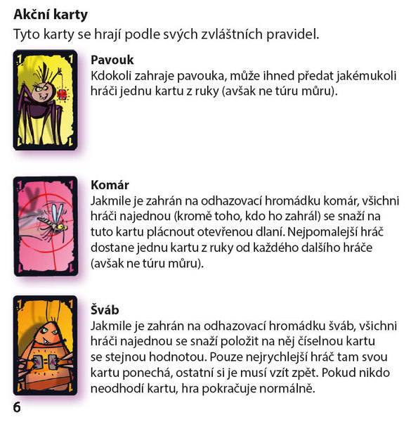 - Mravenec: Po zahrání mravence si každý kromě aktivního hráče musí vzít kartu z dobíracího balíčku.