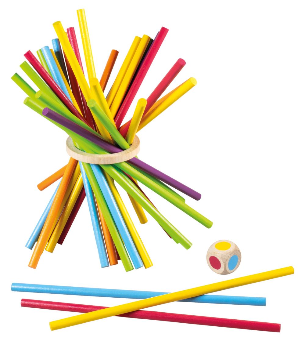 Chcete si zahrát mikádo trochu jinak? Tyčkohraní je hra na procvičení barev a jemné motoriky. Hoďte kostkou a vytáhněte tyčku stejné barvy tak, aby se dřevěné kolečko nedotklo stolu.