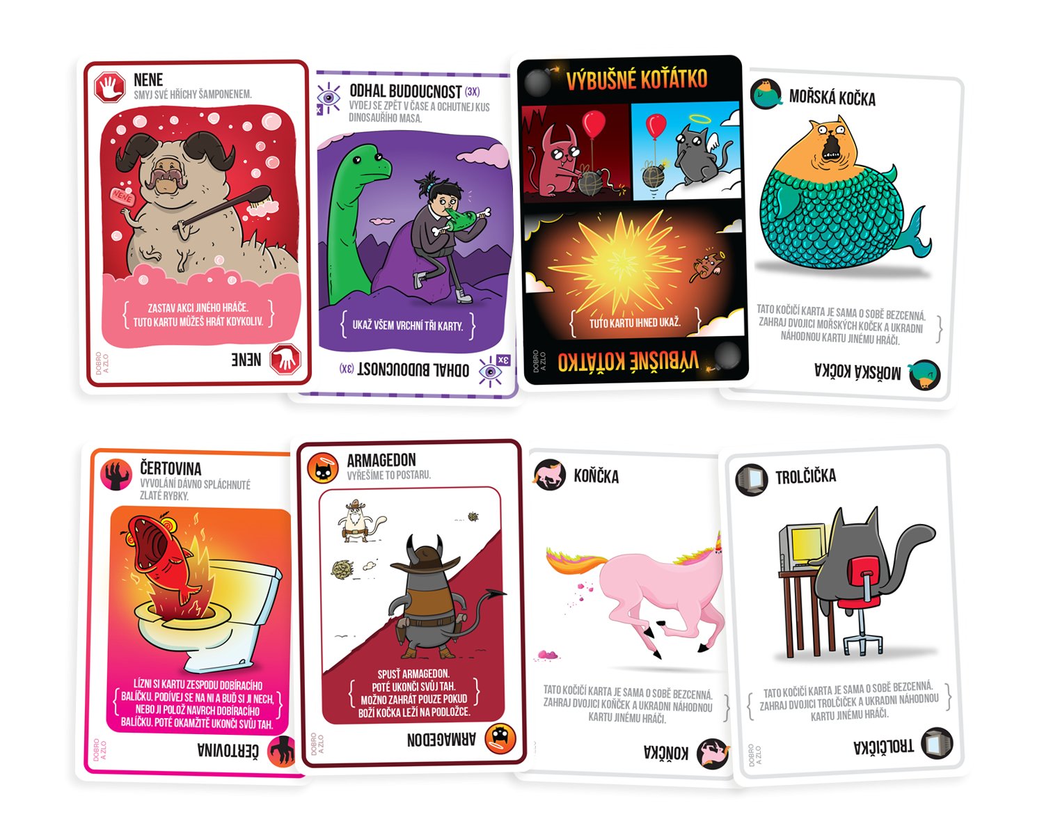 Výbušná koťátka jsou zábavná a strategická hra, která se stala jedním z nejúspěšnějších projektů na Kickstarteru, kdy na ni v roce 2015 přispělo více než 219 000 backerů. Hru vytvořili Elan Lee (XBOX, ARGs), Matthew Inman (The Oatmeal) a Shane Small (XBOX, Marvel), a k roku 2023 se po celém světě prodalo více než 25 milionů kopií. O hře Výbušná koťátka:*Tato hra je vlastně velmi strategickou verzí ruské rulety — s koťátky! Hráči si dobírají karty, dokud někdo nenarazí na Výbušné koťátko, což znamená, že exploduje, zemře a je vyřazen ze hry. Pokud hráč nemá kartu Zneškodni, která mu umožní zneškodnit koťátko pomocí například laserového ukazovátka, podrbání na bříšku nebo sendviče s šantou kočičí, prohrává. Ostatní karty v balíčku pak slouží k tomu, aby hráči pomohli se vyhnout Výbušným koťátkům nebo je nastrčili na cesty ostatním. Vtipné ilustrace a ještě vtipnější texty vás pobaví a vtáhnou do hry, kterou budete chtít hrát pořád dokola. Každá karta je originální! Pravidla hry jsou velmi jednoduchá a dají se vysvětlit za pár vteřin. Přidáním dalšího herního balíčku (například z přisprostlé verze Výbušných koťátek nebo další klasické verze) můžete navýšit počet hráčů až na 9. Pro fajnšmekry a majitele Zombie koťátek je tu rozšířená varianta hry s názvem Zombie apokalypsa: Exploding Kittens je kočičková verze ruské rulety. Hráči se střídají v dobírání karet, dokud někdo nevytáhne Výbušné koťátko a neztratí hru. Balíček obsahuje karty, které vám umožňují vyhnout se explozi tím, že nahlédnete do karet předtím, než si vytáhnete, donutíte svého protivníka vytáhnout více karet nebo zamícháte balík. Každým tahem se hra stává napínavější, protože méně karet v balíčku znamená větší šanci na to, že vytáhnete koťátko a explodujete v ohnivé kouli kočičí hyperboly!