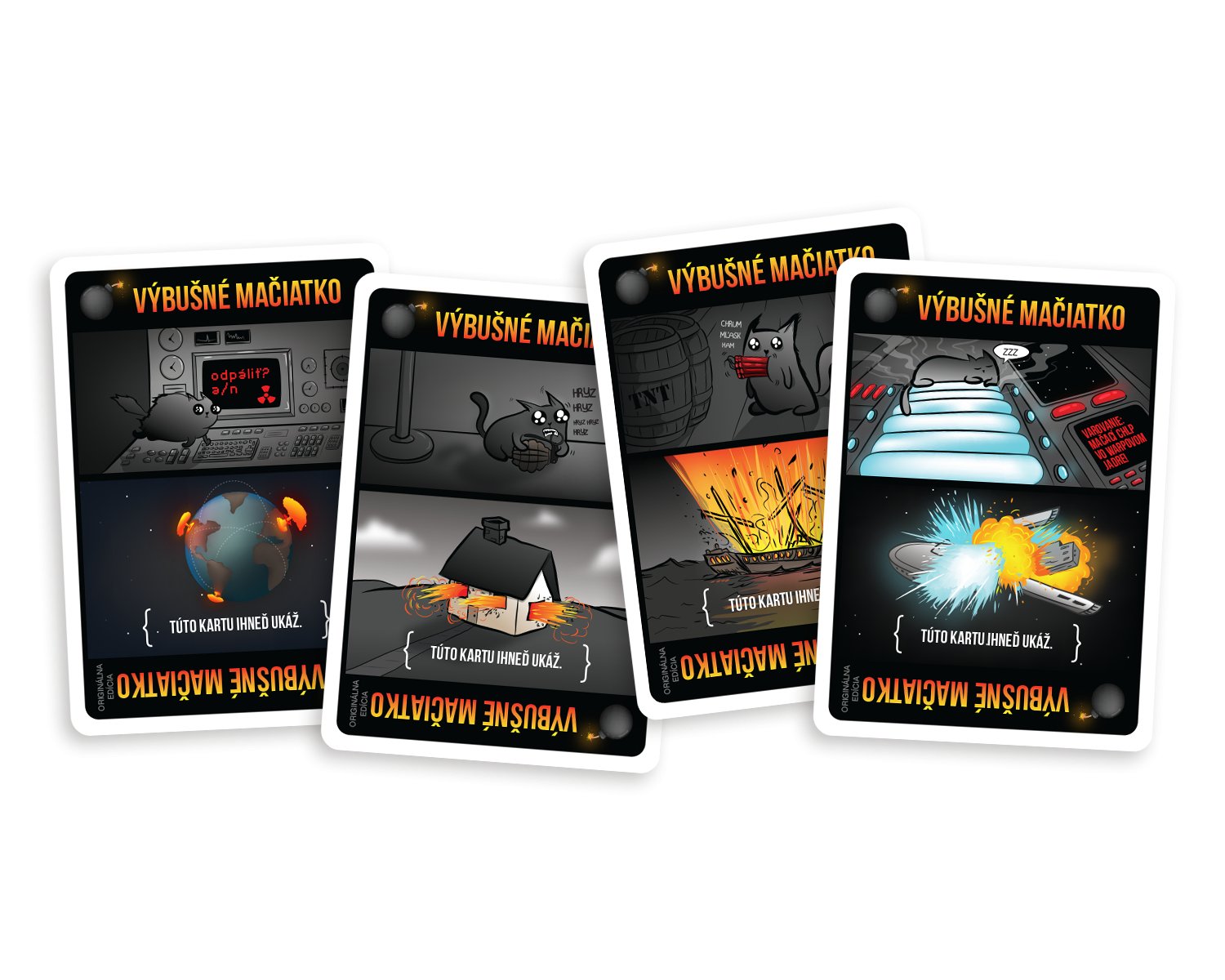 Úlohou všetkých ostatných kariet v balíčku je pomôcť hráčom chrániť sa pred výbušnými mačiatkami, alebo ich nastrčiť do cesty ostatným. Vtipné ilustrácie s ešte vtipnejšími textami vás pobavia a úplne vtiahnu do hry, ktorú budete chcieť hrať stále dokola. Každá karta je originál a pravidlá hry sú veľmi jednoduché a vysvetlené za pár sekúnd.