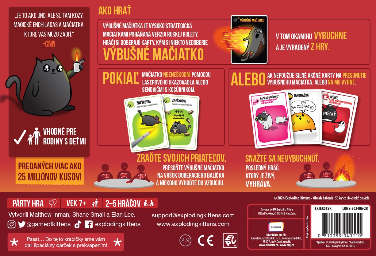 Výbušné mačiatka sú strategickou verziou ruskej rulety, ale s mačiatkami! Hráči si doberajú karty, kým si niekto nedoberie výbušné mačiatko. Ak exploduje, hráč je vyradený z hry, pokiaľ nemá kartu "zneškodni", ktorá mu umožní mačiatko zneškodniť rôznymi spôsobmi, ako napríklad laserovým ukazovadlom, poškrabkaním na brušku alebo sendvičom s kocúrnikom. Úlohou ostatných kariet v hre je chrániť hráčov pred výbušnými mačiatkami alebo ich poslať do cesty ostatným. Vtipné ilustrácie a humorné texty vás pobavia a vtiahnu do hry, ktorú budete chcieť hrať stále dokola. Pravidlá hry sú jednoduché a dajú sa vysvetliť za pár sekúnd. Historické okienko: Výbušné mačiatka sú hrou s historicky najviac prispievateľmi na Kickstarteri. Hru vytvorili Elan Lee (XBOX, ARGs), Matthew Inman (The Oatmeal) a Shane Small (XBOX, Marvel). V roku 2015 na ich projekt prispelo viac ako 219 000 backerov, a do roku 2023 sa predalo viac ako 25 miliónov kópií po celom svete. Obsah balenia: - 56 kariet - 1 slovenské pravidlá Pripravte sa na zábavnú a napínavú hru, kde úspech závisí od stratégie a šťastia!