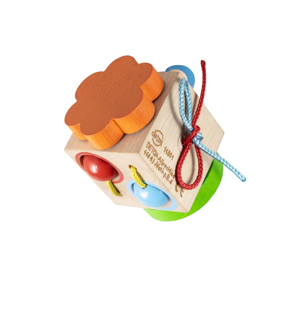 Montessori kostka, obasahujíc několik variant drobných činností k procvičení motorických schopností dítěte. Vhodné pro děti od 18m. Velikost hračky 70x70x70mm. Upevněno na paírové kartě